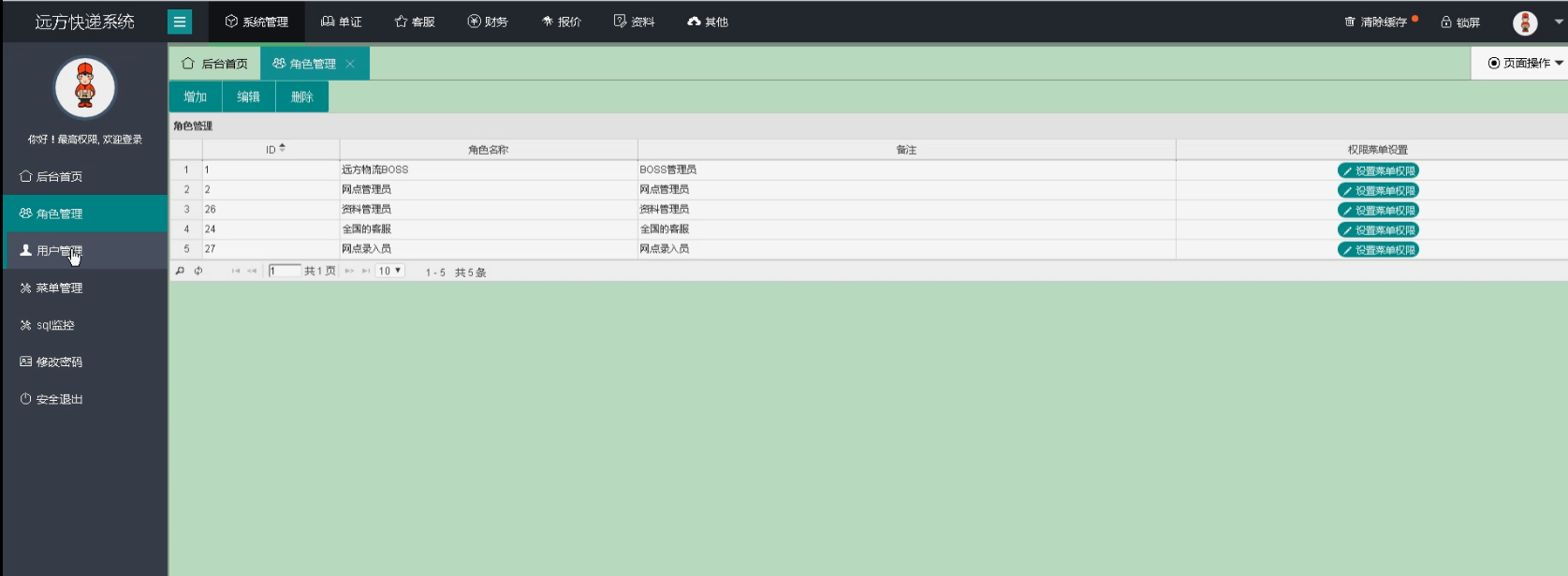 系统管理模块包括角色管理、用户管理、修改密码。最高权限管理员可以通过角色管理去设置普通管理员的权限,通过用户管理修改、删除普通管理员等操作。普通管理员只能修改自己的密码。