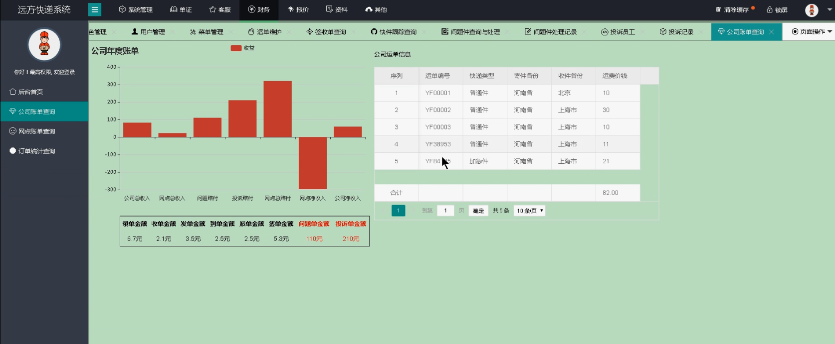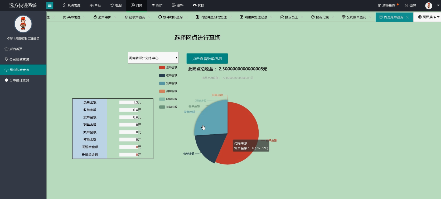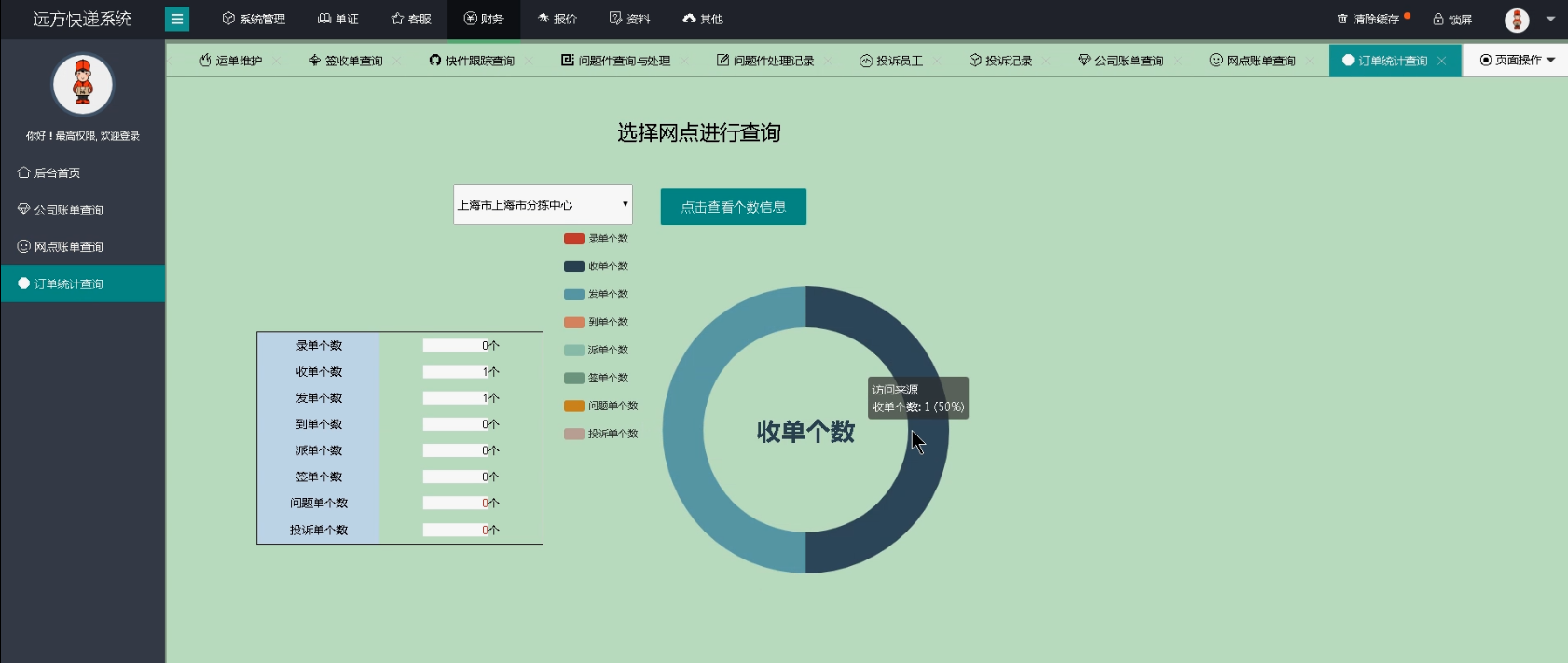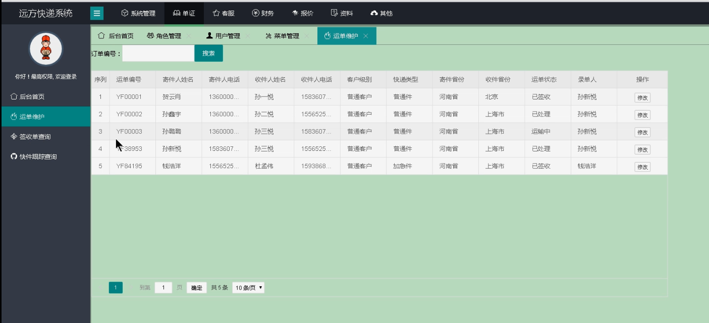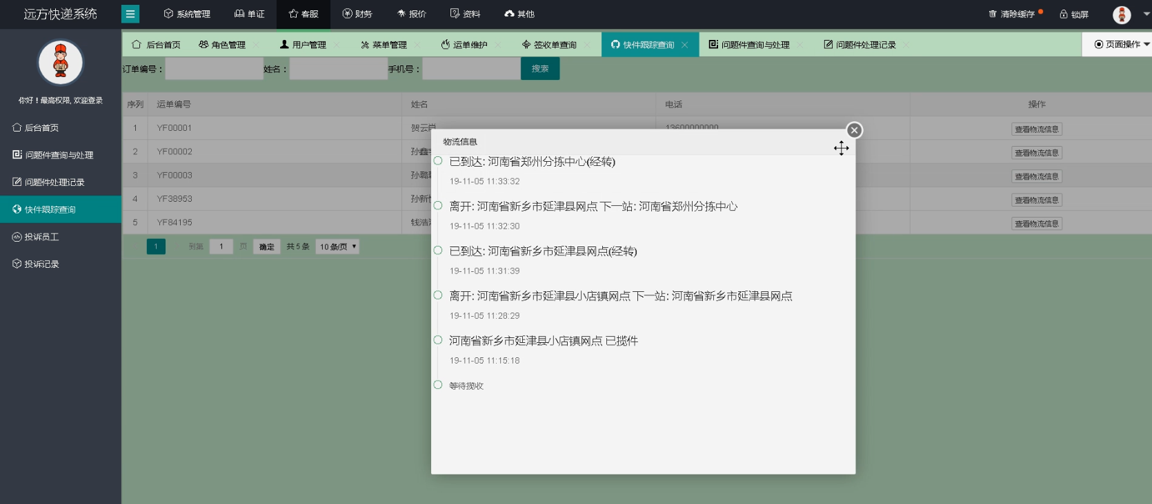 单证模块主要就是运单维护、签收单查询和快件跟踪查询。管理员可以通过单号搜索寄件信息,对运输中的订单可以进行信息修改;签收单查询就是查看已签收的订单详细信息的功能,最后快件跟踪查询是对快件跟踪报道,每个经停站都会记录。