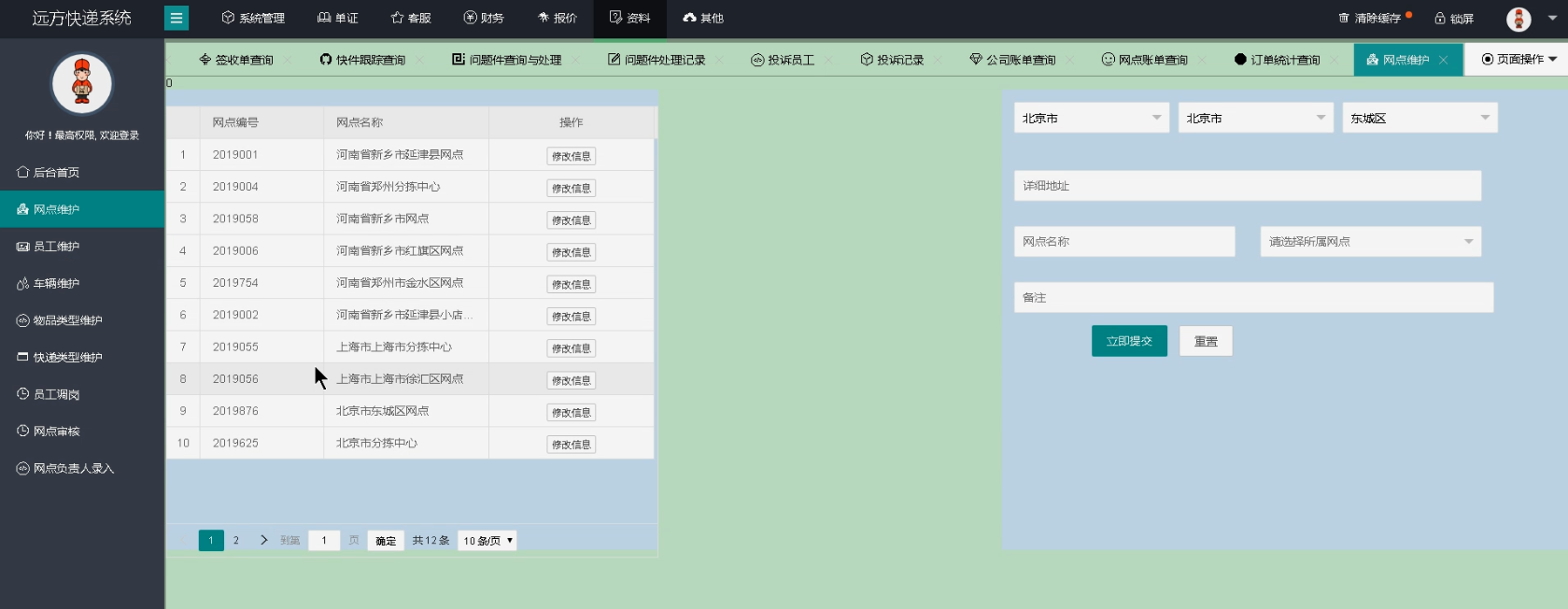 资料模块是系统的主要模块,其中有网点维护、员工维护、车辆维护、物品类型维护和快递类型维护。通过该模块的网点维护可以添加、修改网点的信息,而添加网点的话就要为其添加员工;员工维护模块就是为其网点服务的,可以添加、删除和编辑员工的资料,添加时就会对其所在的网点进行确认,确定员工是属于哪个网点;剩下车辆维护、物品类型维护和快递类型维护都是对其资料的增删查。