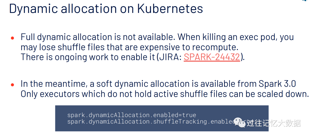 目前 Spark on K8S 还不支持动态资源分配的全部功能。当我们杀掉 pod 时,上面的 shuffle 文件将会被丢失。