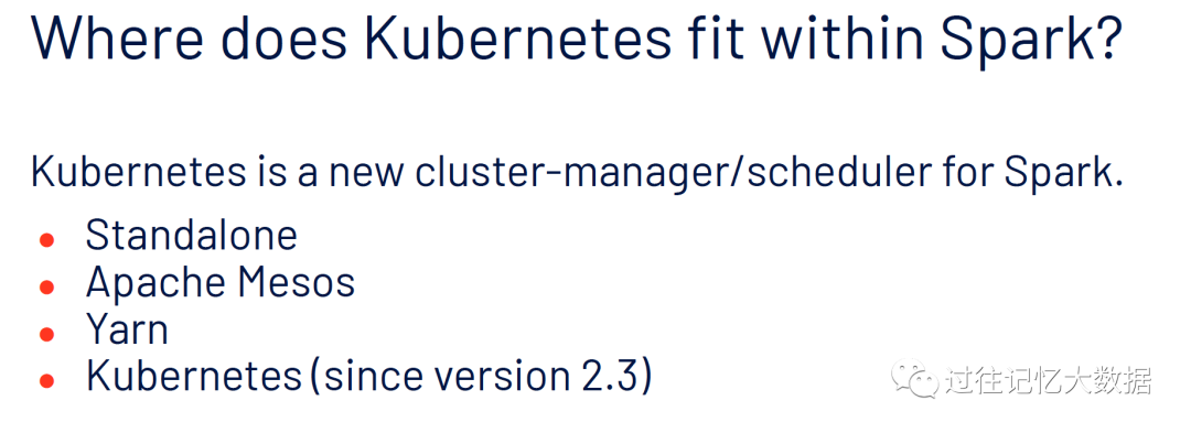 Spark 哪个地方需要用到 K8S 呢?K8S 是 Spark 上全新的集群管理和调度系统,其他三个资源管理和调度为 Standalone、YARN 以及 Apache Mesos。
