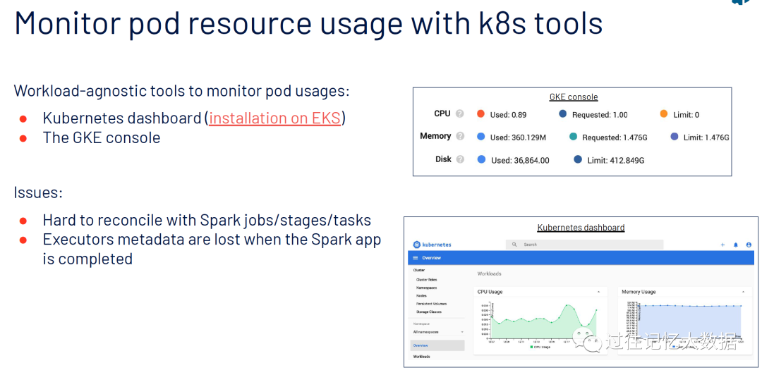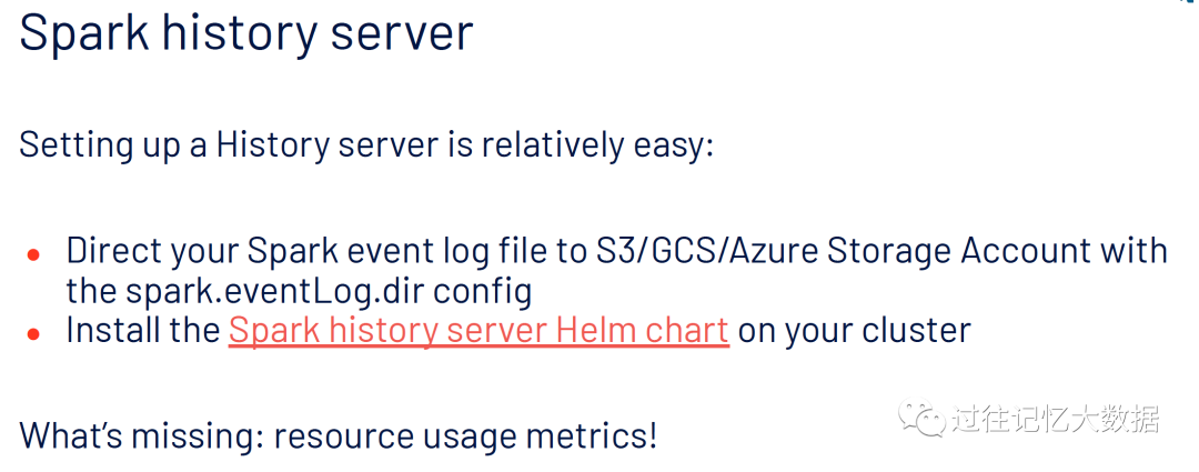 上面的问题我们可以通过按照 Spark 历史服务器来解决。可以将 Spark 的事件日志存放在 S3/GCS/Azoure 存储文件,并配置 spark.eventLog.dir 参数到相关路径。但是这种方式我们无法获取资源使用相关的 metrics!