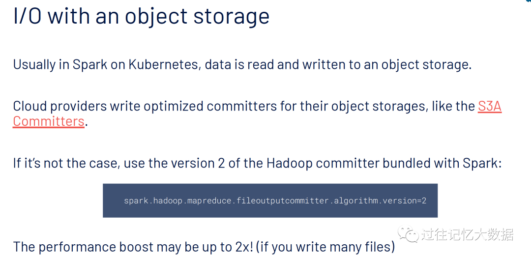 Spark on K8S 的场景下,数据的读写一般都是经过对象存储的。云厂商一般会为其对象存储提供写优化的 committers,比如 S3A Committers。