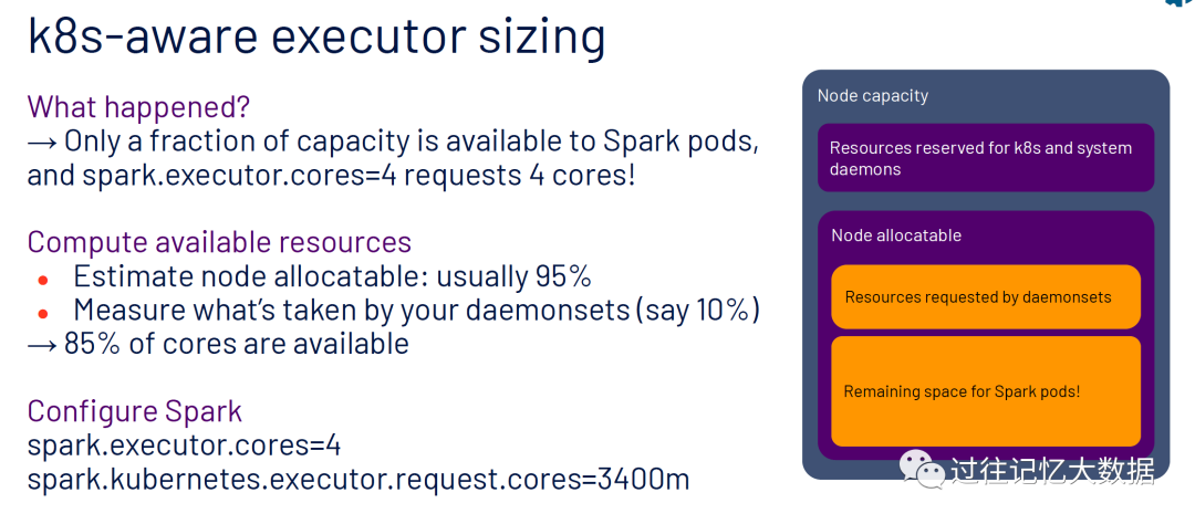 上面设置之所以申请不到 executor,是因为:K8S 实例上的资源只有一部分是可以给 Spark pods 的。我们需要预留一部分资源给 K8S 以及系统守护进程,这部分大概占用 5%。所以我们的节点只能申请到 95% 的资源,在这些资源中 10% 需要给一些守护进程使用,所以整个实例我们只能申请到 95% * 90% = 85% 的资源。