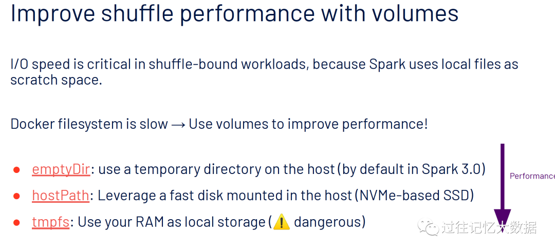 I/O 速度对于 shuffle 很重的工作负载来说至关重要,因为 Spark 会将 shuffle 的数据写到本地文件。但是 Docker 的文件系统非常慢,我们可以通过 Kubernetes Volumes 来提升性能。具体参见 https://spark.apache.org/docs/3.0.0-preview2/running-on-kubernetes.html#using-kubernetes-volumes。