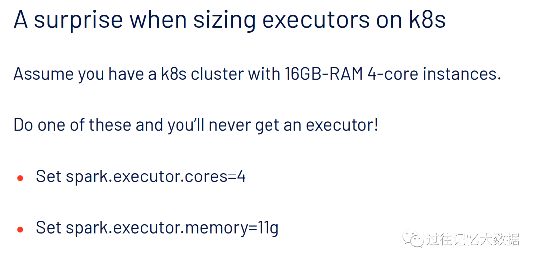 假设我们有一个 K8S 集群,每个实例配置是 16GB 内存和4核;如果我们选择以下两种中的一种配置我们都将申请不到 executor: