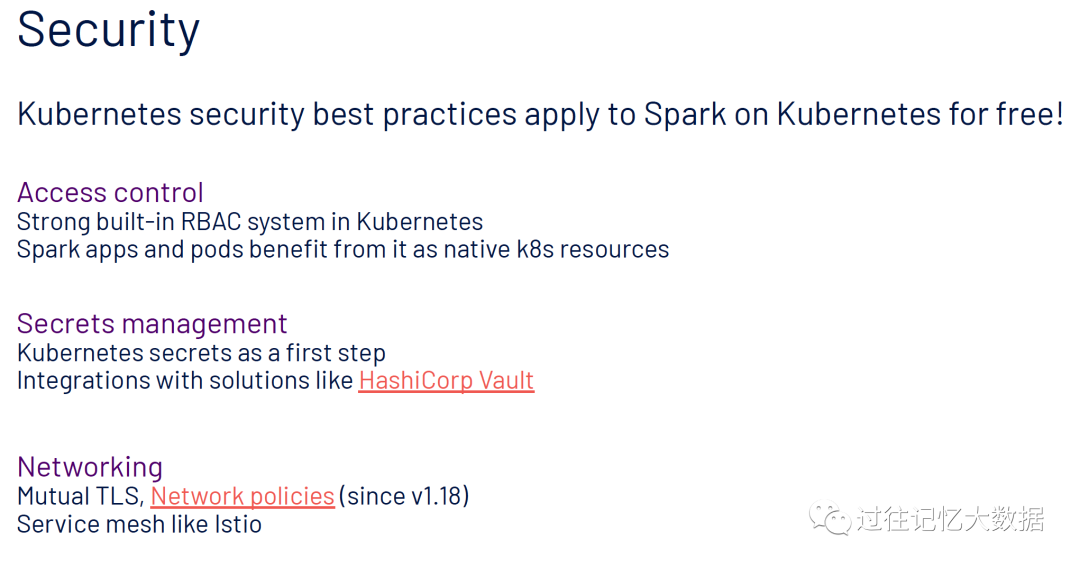 K8S 上的安全最佳实践对 Spark on K8S 来说是可以免费使用的!我们可以进行访问控制、密码配置以及网络安全配置等。