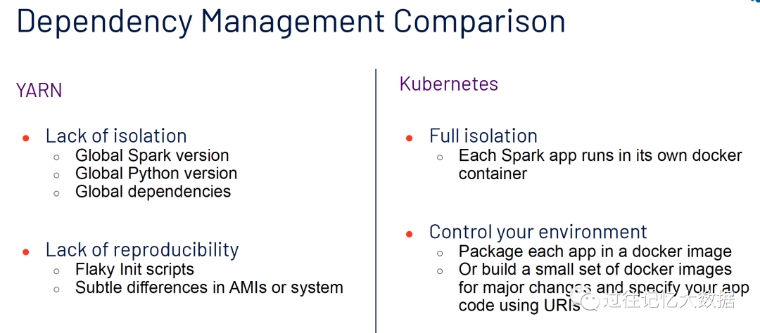 YARN 集群中的 Spark 版本、Python 版本以及依赖都是全局配置的,缺乏隔离。(过往记忆大数据备注:YARN 集群上是可以运行不同版本的 Spark 以及 Python,这个我之前有相关文章介绍的。关于依赖其实也有办法进行配置的。) 而 K8S 方式作业之间都是隔离的。