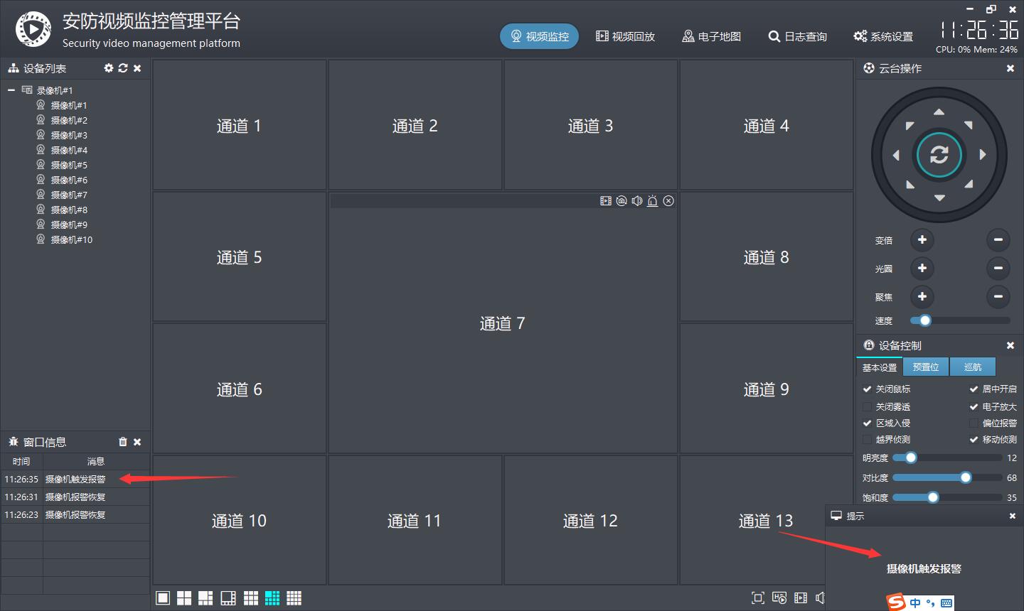 - 云台控制,上下左右移动,焦距放大缩小,相对和绝对移动。
