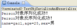 1 import java.io.File; 2 import java.io.FileInputStream; 3 import java.io.FileNotFoundException; 4 import java.io.FileOutputStream; 5 import java.io.IOException; 6 import java.io.ObjectInputStream; 7 import java.io.ObjectOutputStream; 8 import java.text.MessageFormat; 9 10 /** 11 * <p>ClassName: TestObjSerializeAndDeserialize<p> 12 * <p>Description: 测试对象的序列化和反序列<p> 13 * @author xudp 14 * @version 1.0 V 15 * @createTime 2014-6-9 下午03:17:25 16 */ 17 public class TestObjSerializeAndDeserialize { 18 19 public static void main(String[] args) throws Exception { 20 SerializePerson();//序列化Person对象 21 Person p = DeserializePerson();//反序列Perons对象 22 System.out.println(MessageFormat.format("name={0},age={1},sex={2}", 23 p.getName(), p.getAge(), p.getSex())); 24 } 25 26 /** 27 * MethodName: SerializePerson 28 * Description: 序列化Person对象 29 * @author xudp 30 * @throws FileNotFoundException 31 * @throws IOException 32 */ 33 private static void SerializePerson() throws FileNotFoundException, 34 IOException { 35 Person person = new Person(); 36 person.setName("gacl"); 37 person.setAge(25); 38 person.setSex("男"); 39 // ObjectOutputStream 对象输出流,将Person对象存储到E盘的Person.txt文件中,完成对Person对象的序列化操作 40 ObjectOutputStream oo = new ObjectOutputStream(new FileOutputStream( 41 new File("E:/Person.txt"))); 42 oo.writeObject(person); 43 System.out.println("Person对象序列化成功!"); 44 oo.close(); 45 } 46 47 /** 48 * MethodName: DeserializePerson 49 * Description: 反序列Perons对象 50 * @author xudp 51 * @return 52 * @throws Exception 53 * @throws IOException 54 */ 55 private static Person DeserializePerson() throws Exception, IOException { 56 ObjectInputStream ois = new ObjectInputStream(new FileInputStream( 57 new File("E:/Person.txt"))); 58 Person person = (Person) ois.readObject(); 59 System.out.println("Person对象反序列化成功!"); 60 return person; 61 } 62 63 }