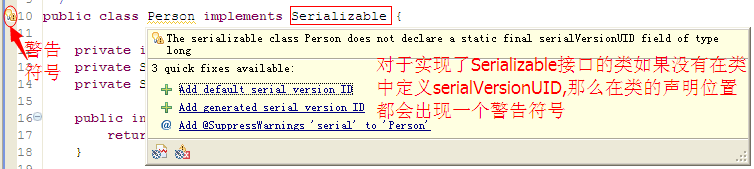 实现Serializable接口的类如果类中没有添加serialVersionUID,那么就会出现如下的警告提示