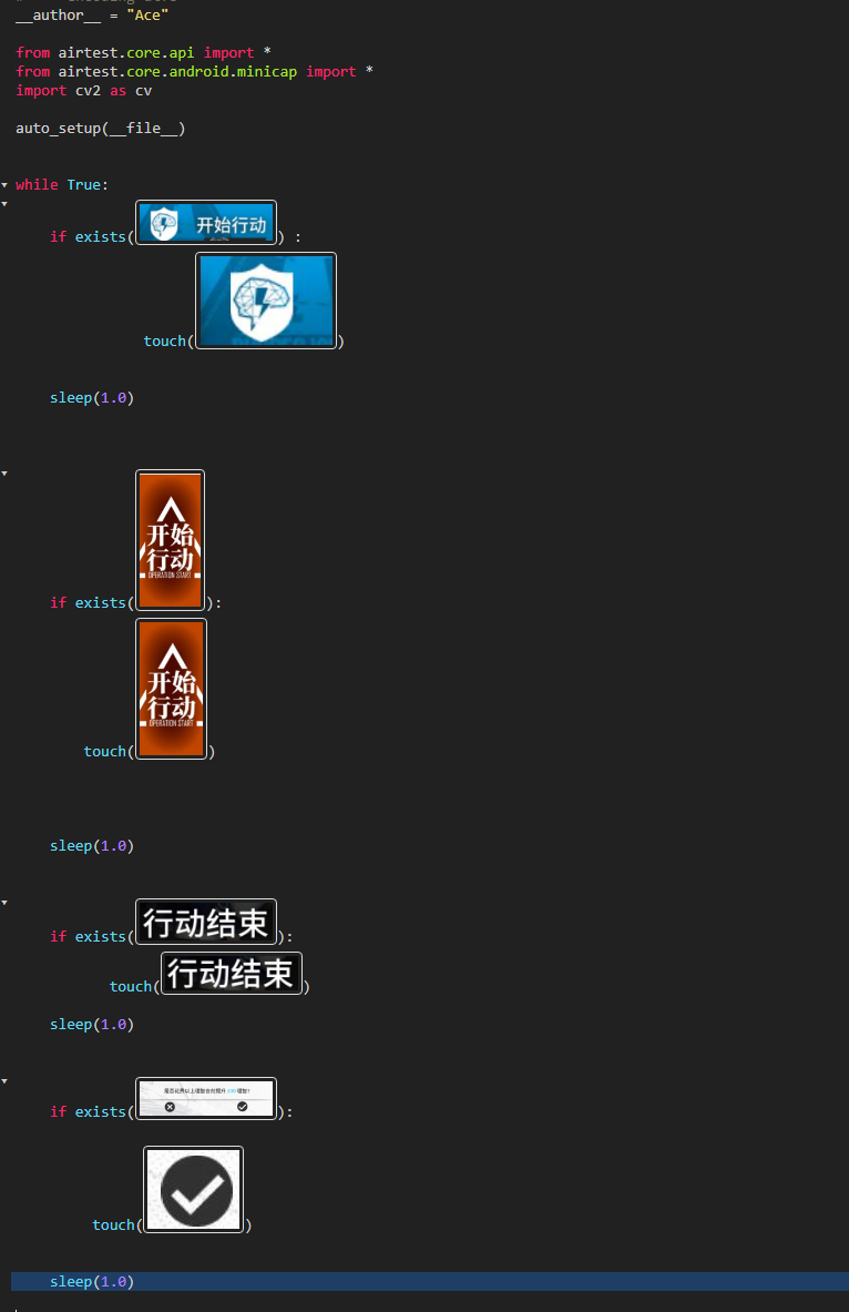 ide的脚本写起来比较简单, 遇到相应的图片就点击就行, 函数需要图片的时候是可以直接在屏幕里面框选的, 并且识别的可信度等都可以双击图片修改, 十分方便
