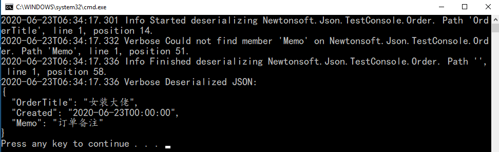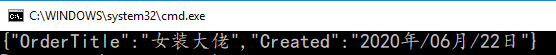var json = "{'OrderTitle':'女装大佬', 'Created':'2020/6/23','Memo':'订单备注'}";
