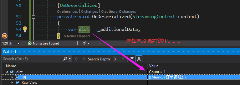 我依稀的记得 WCF 在这种场景下也是使用一个 ExtenstionDataObject 来存储客户端传过来的未知字段,有可能是客户端的 model 已更新,server端还是旧版本,通常在 json 序列化中也会遇到这种情况,在 JsonConvert 中使用 _additionalData 就可以帮你搞定,在 OnDeserialized 这种AOP方法中进行拦截,如下代码: