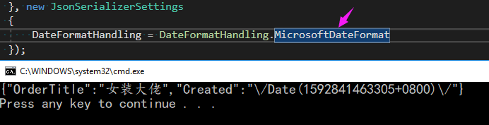 对了,我记得很早的时候,C# 自带了一个 JavaScriptSerializer, 也是用来进行 model 转 json的,但是它会将 datetime 转成 时间戳,而不是时间字符串形式,如果你因为特殊原因想通过 JsonConvert 将时间生成时间戳的话,也是可以的, 用 DateFormatHandling.MicrosoftDateFormat 枚举指定一下即可,如下: