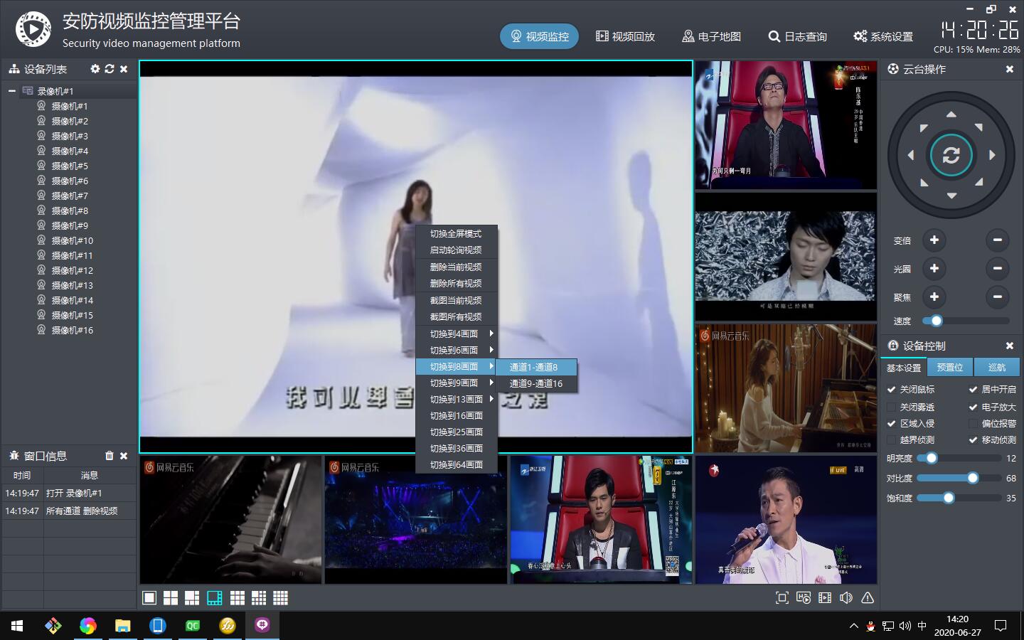 - 支持多画面切换,全屏切换等,包括1+4+6+8+9+13+16+25+36+64画面切换。