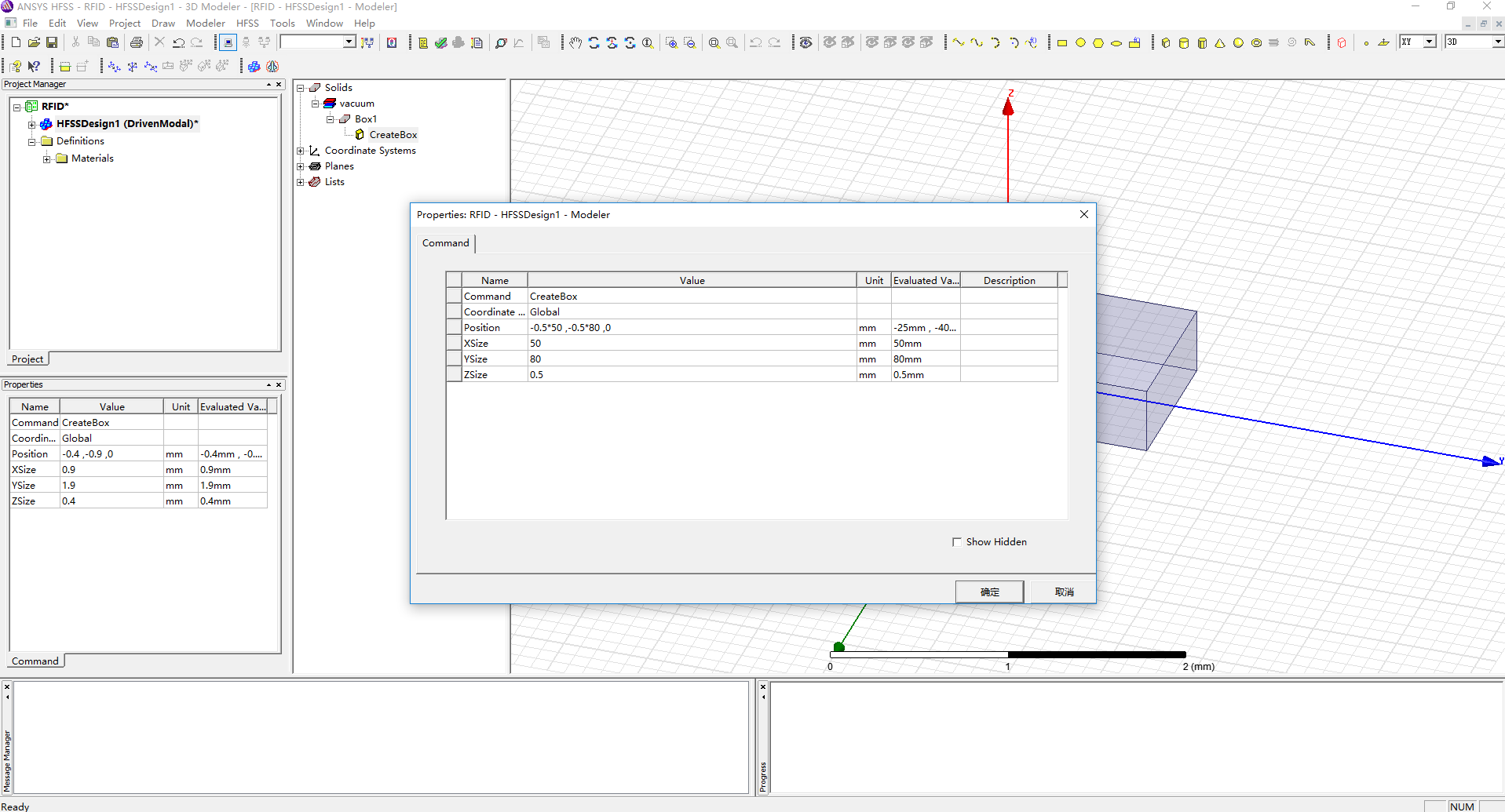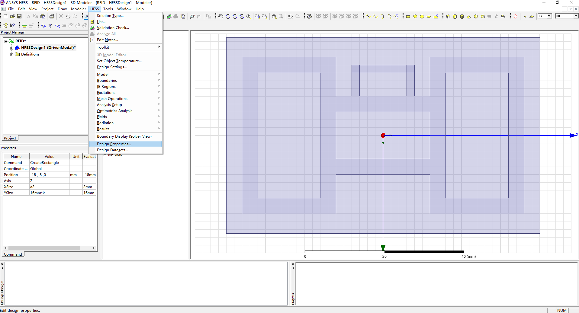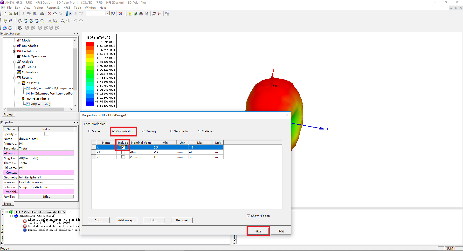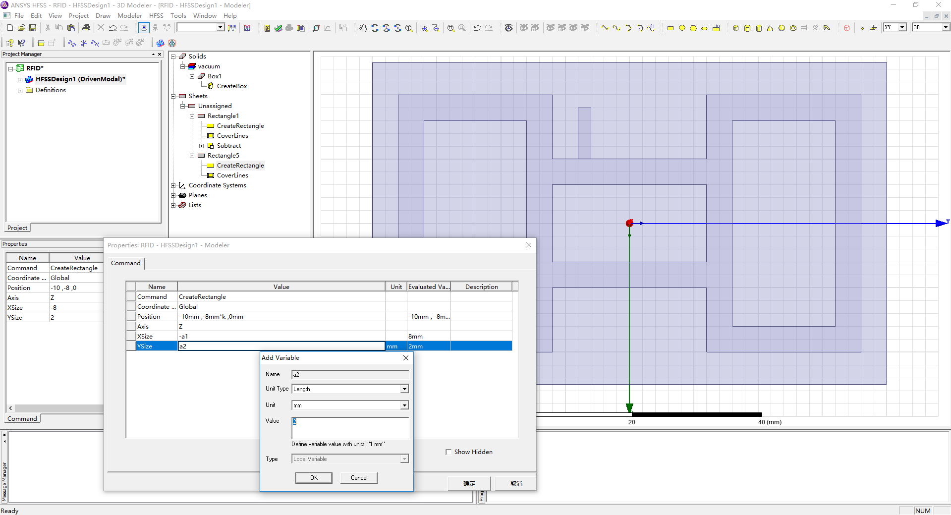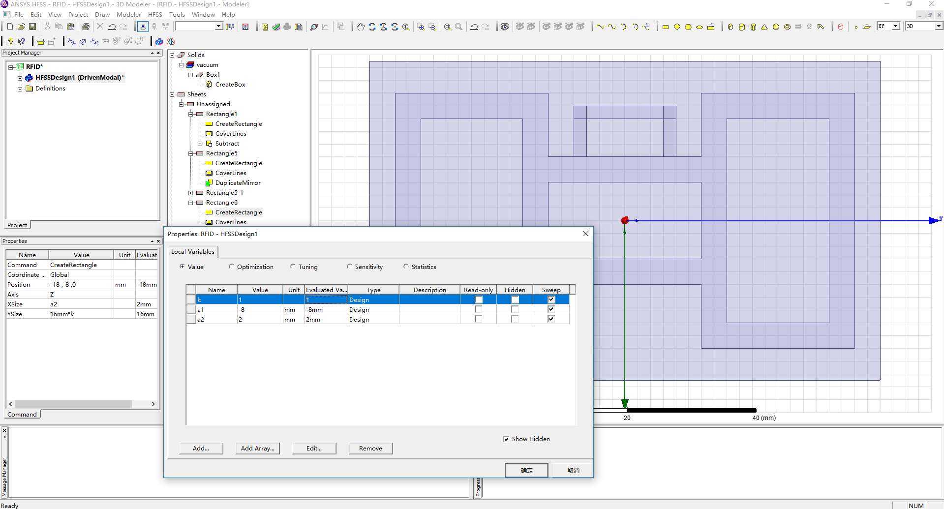 注意此处设置k为数字,a1和a2为长度,注意看每个参数的写法。k, a1, a2这些参数可在HFSS-Design Properties中进行修改,如下图所示。