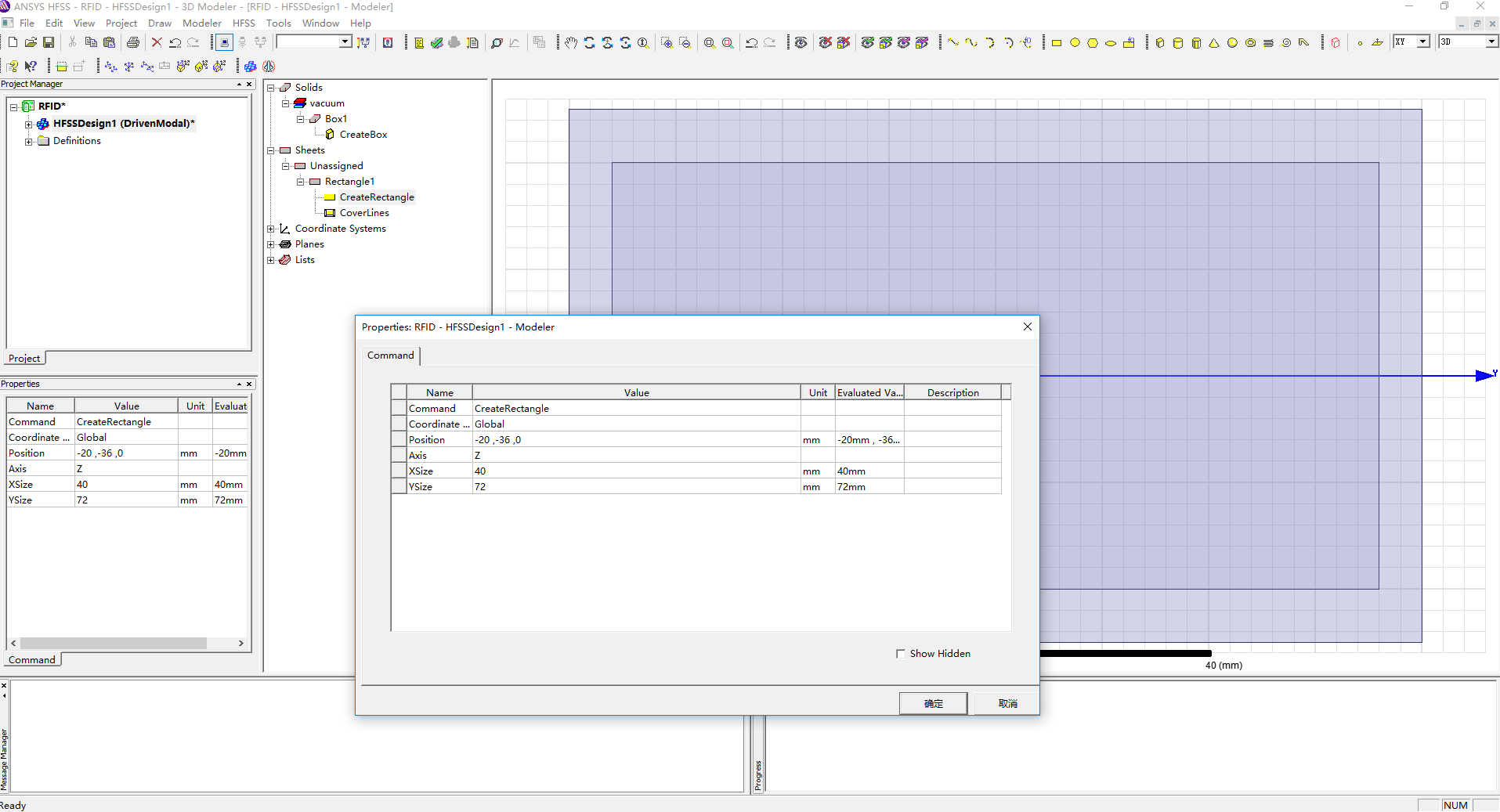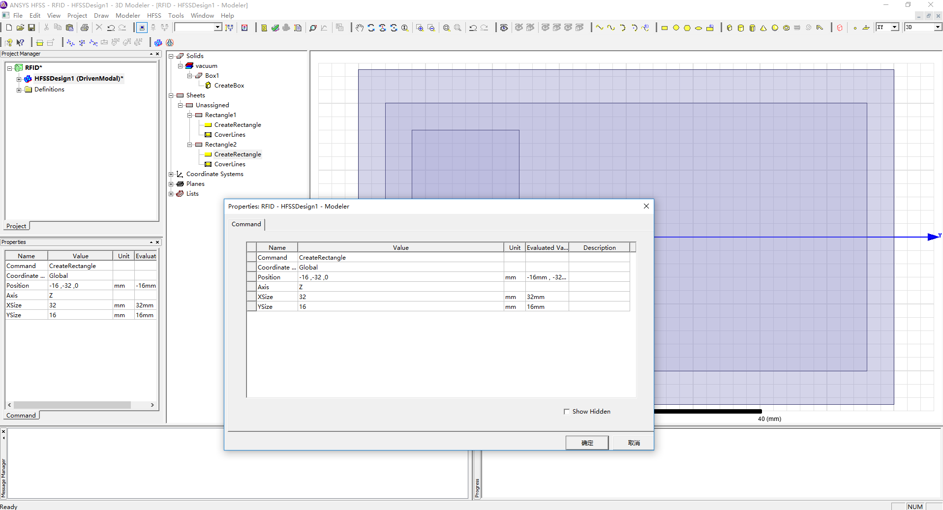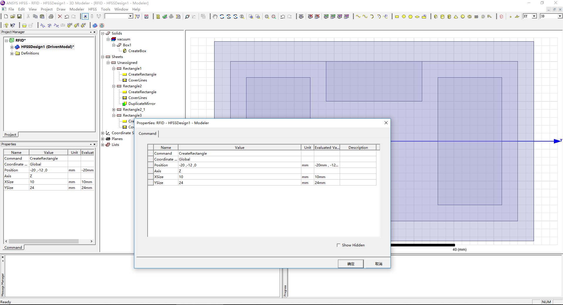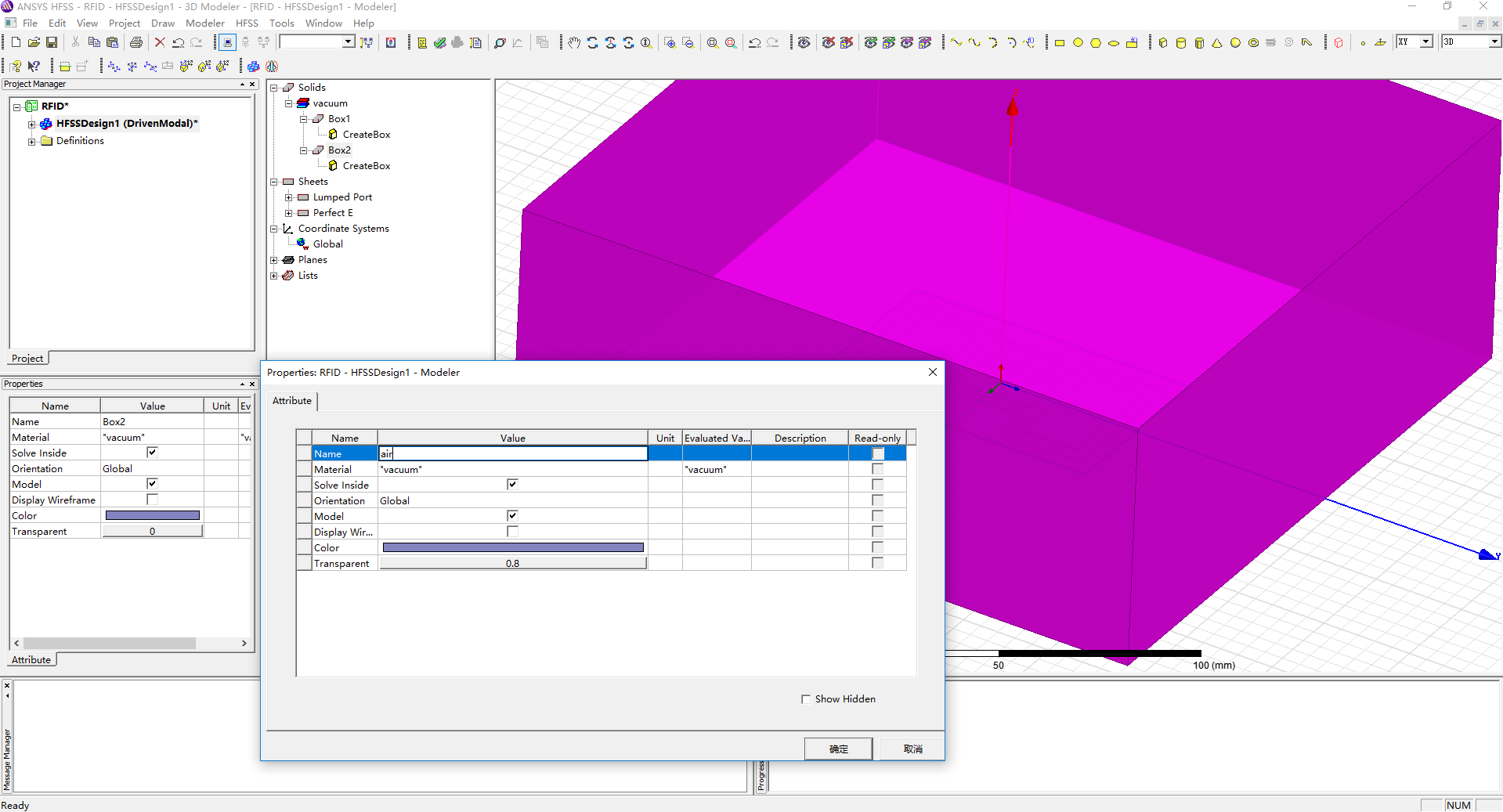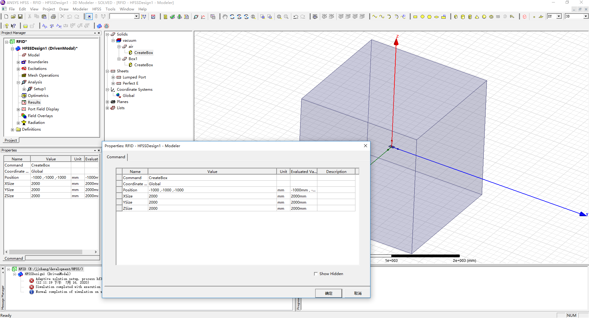 注意此处设置k为数字,a1和a2为长度,注意看每个参数的写法。k, a1, a2这些参数可在HFSS-Design Properties中进行修改,如下图所示。