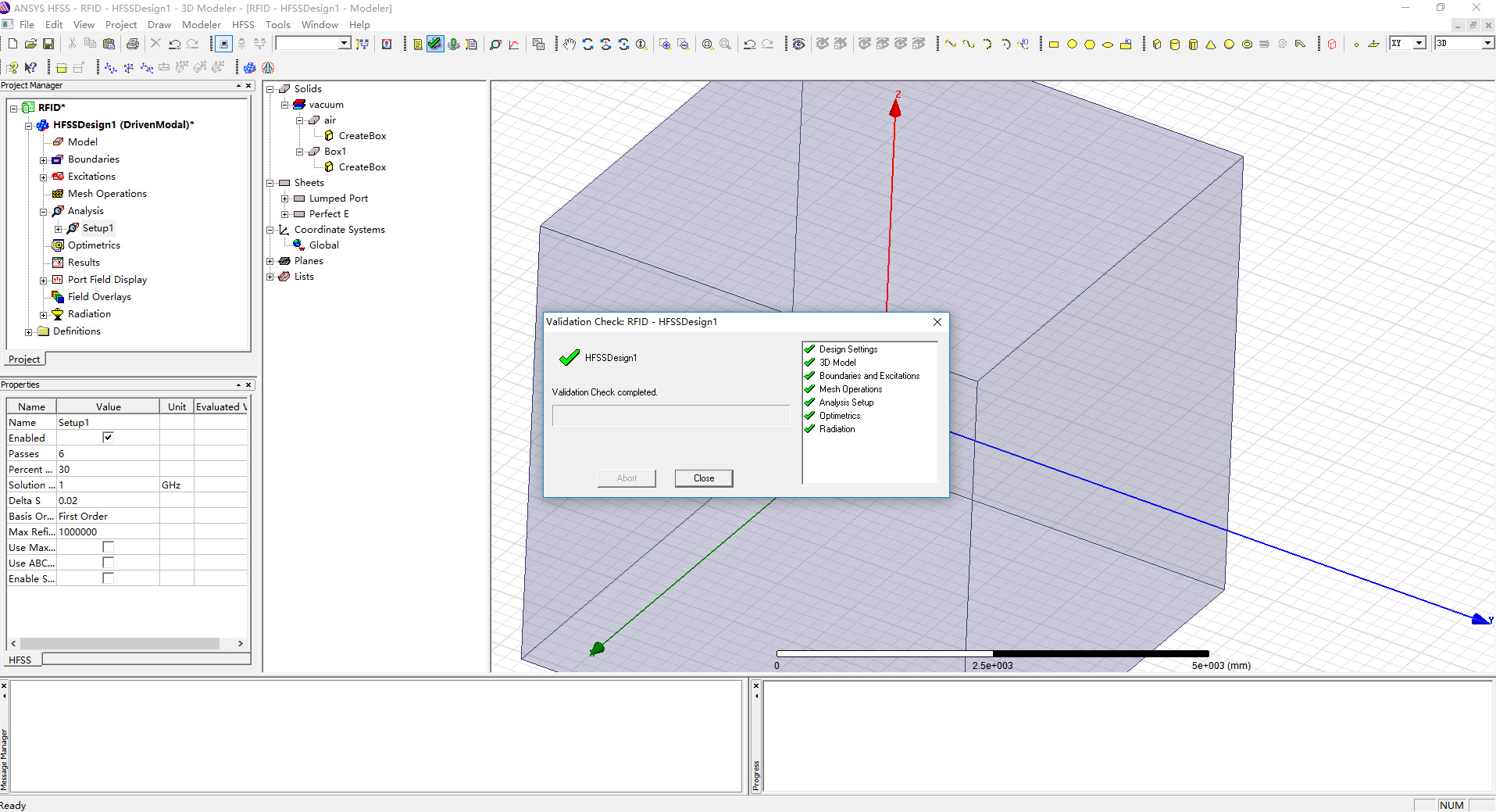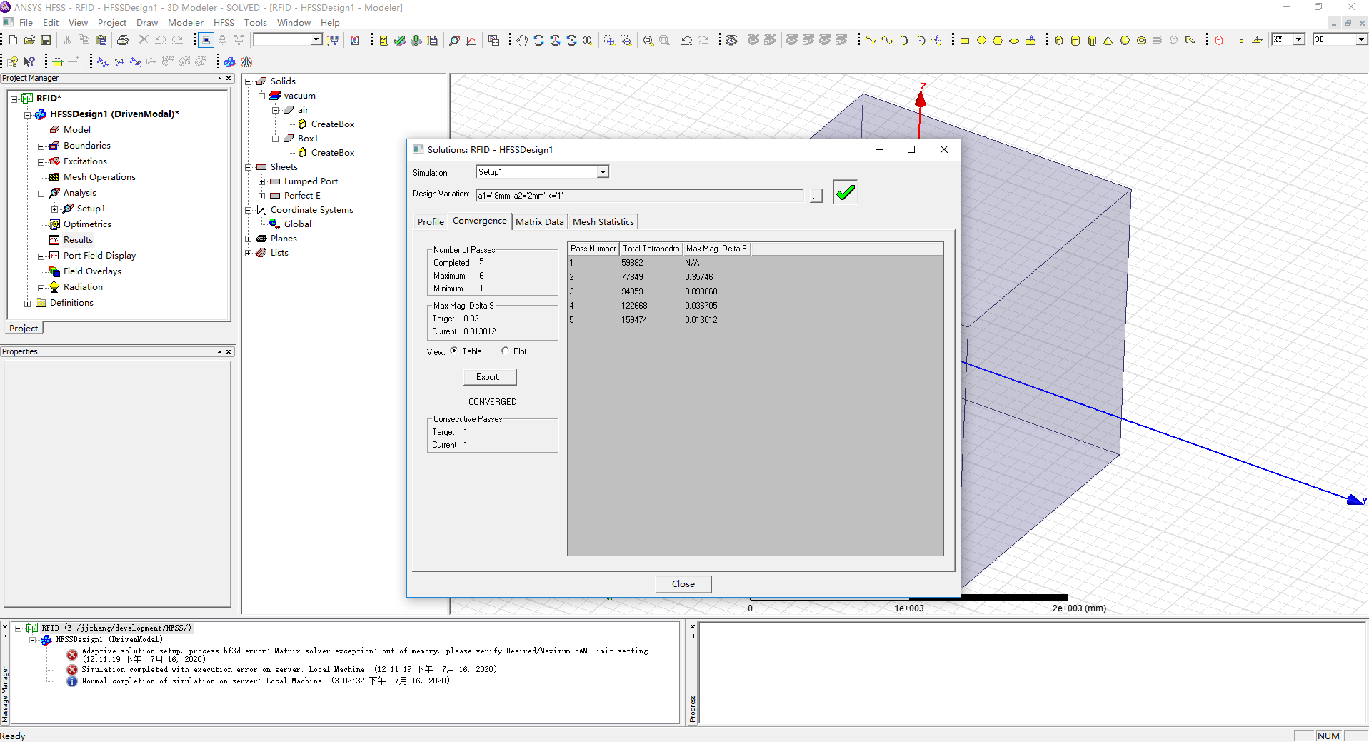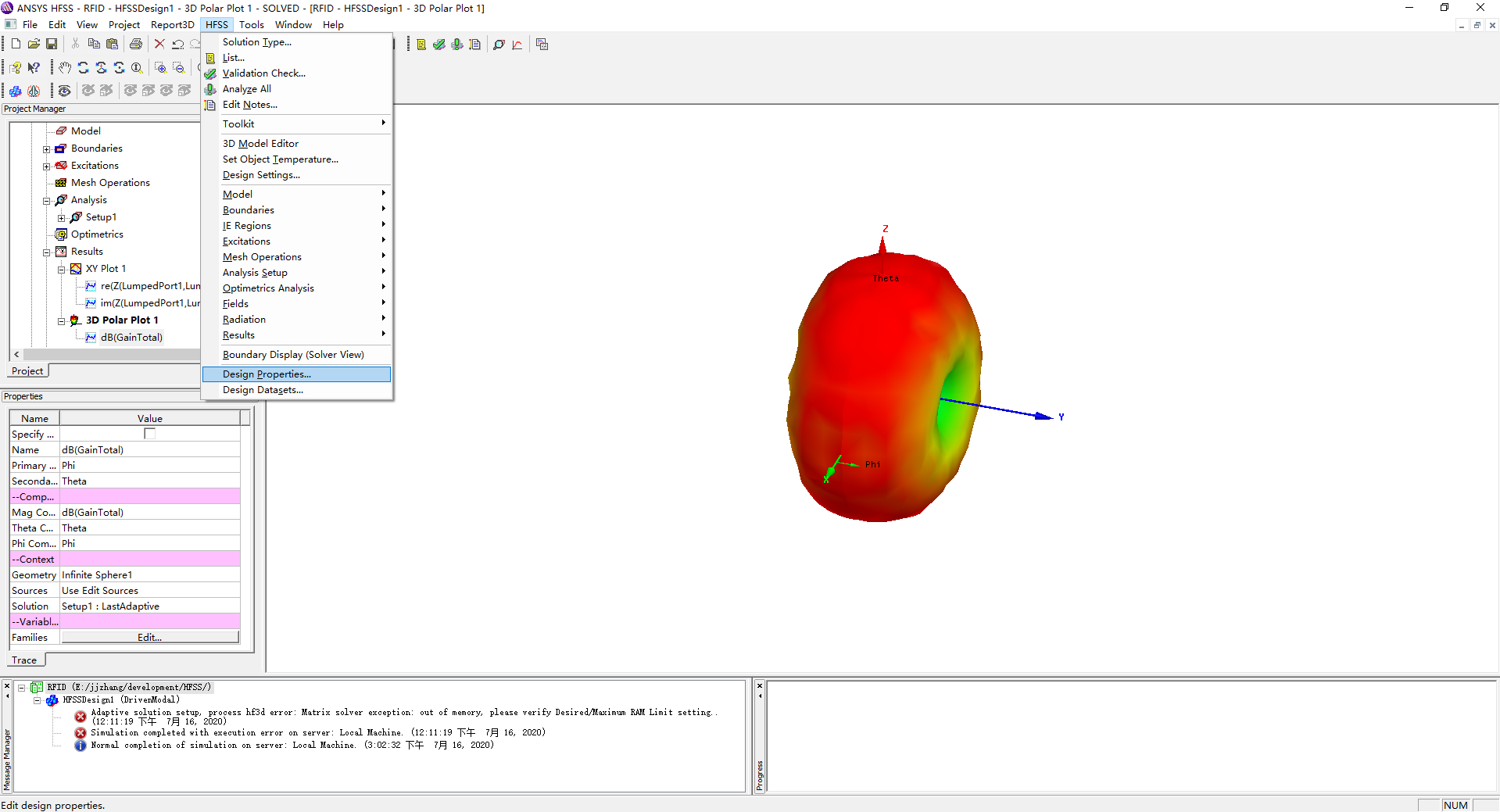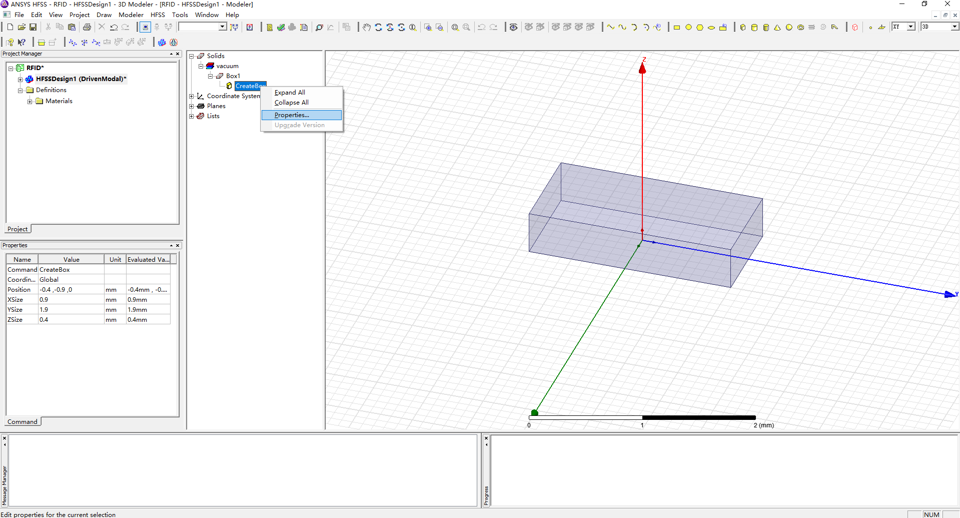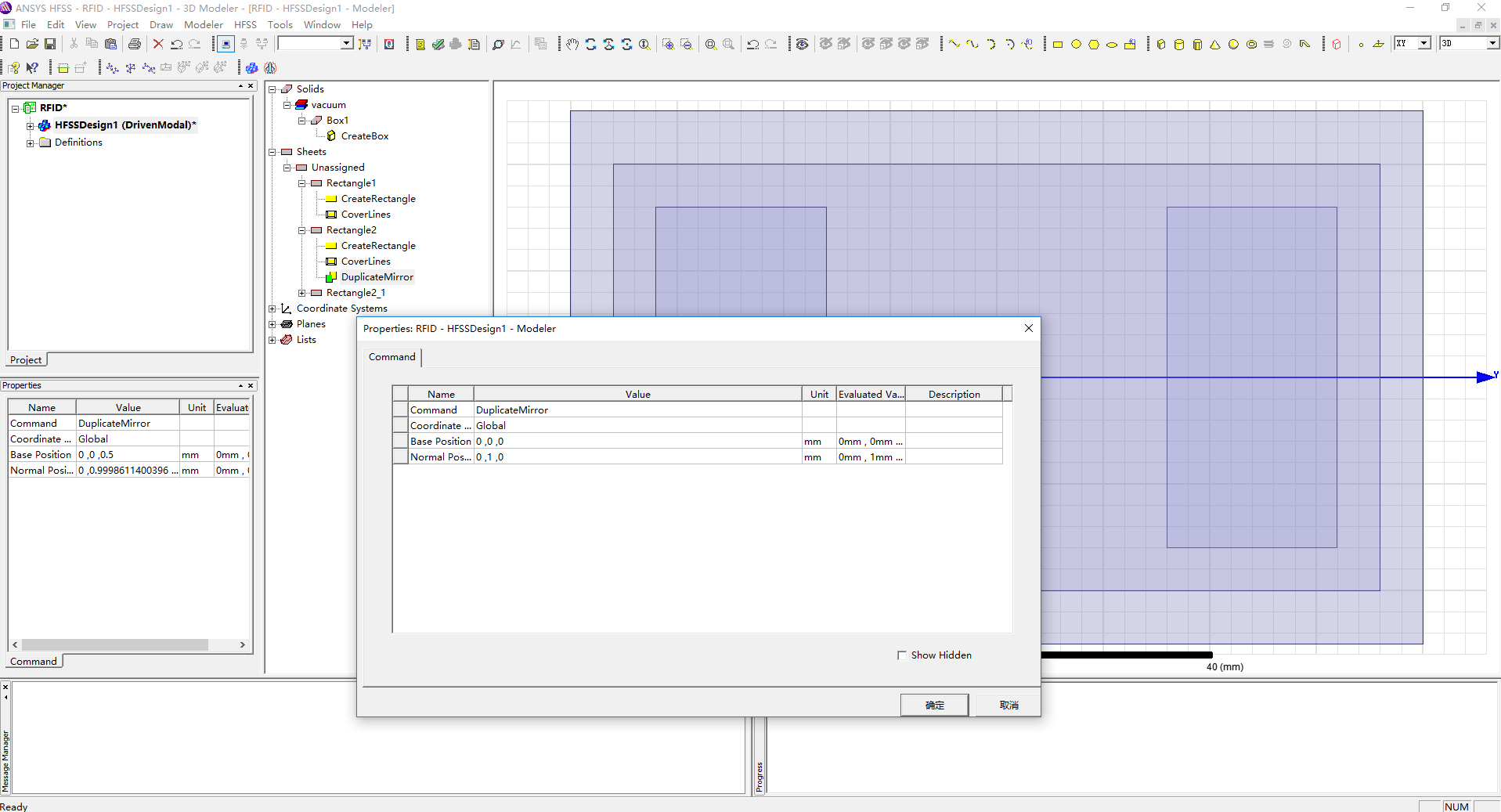 注意此处设置k为数字,a1和a2为长度,注意看每个参数的写法。k, a1, a2这些参数可在HFSS-Design Properties中进行修改,如下图所示。