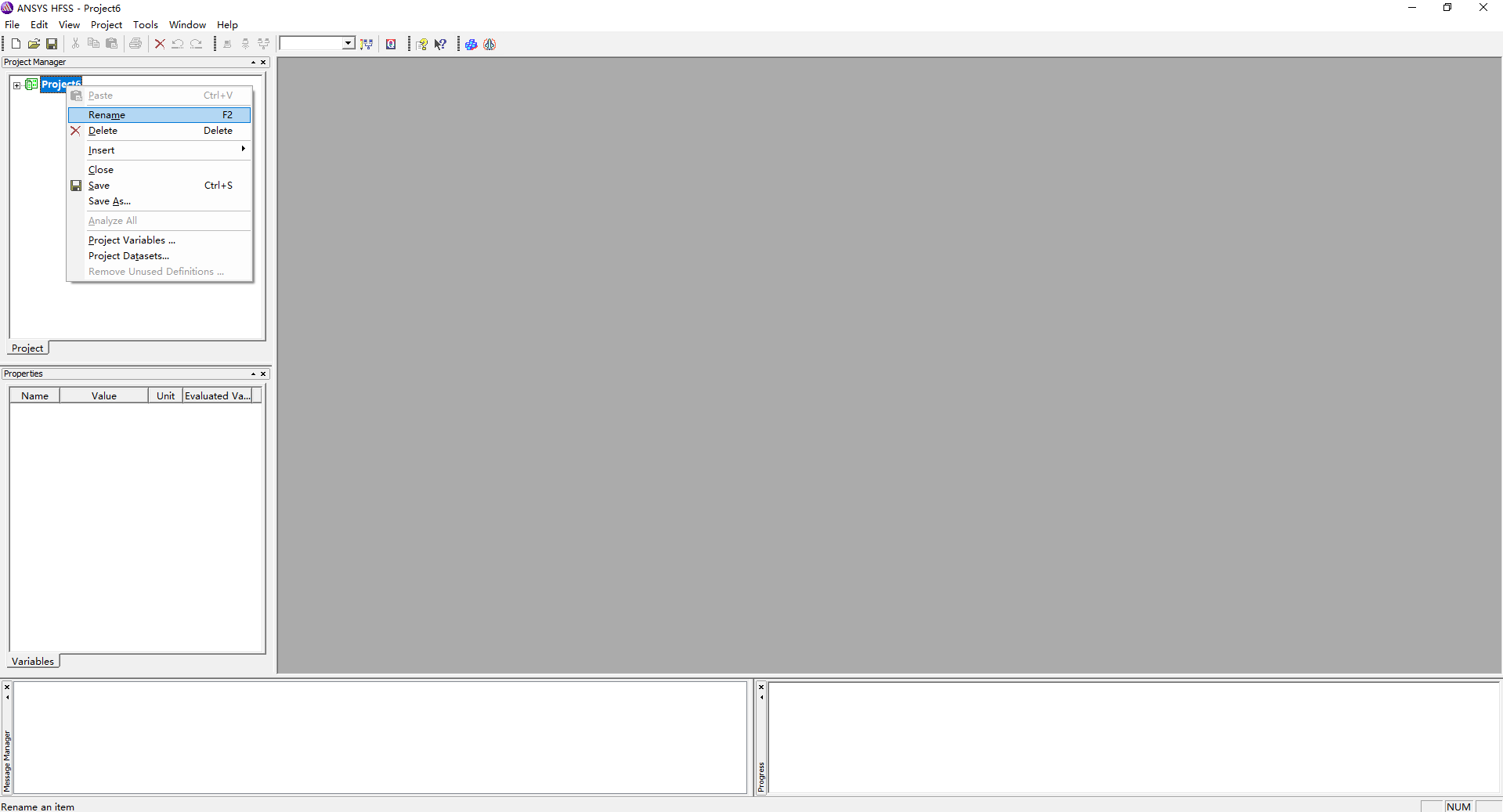 打开HFSS软件,可看到左侧临时工程文件,点击右键将名称改为RFID。