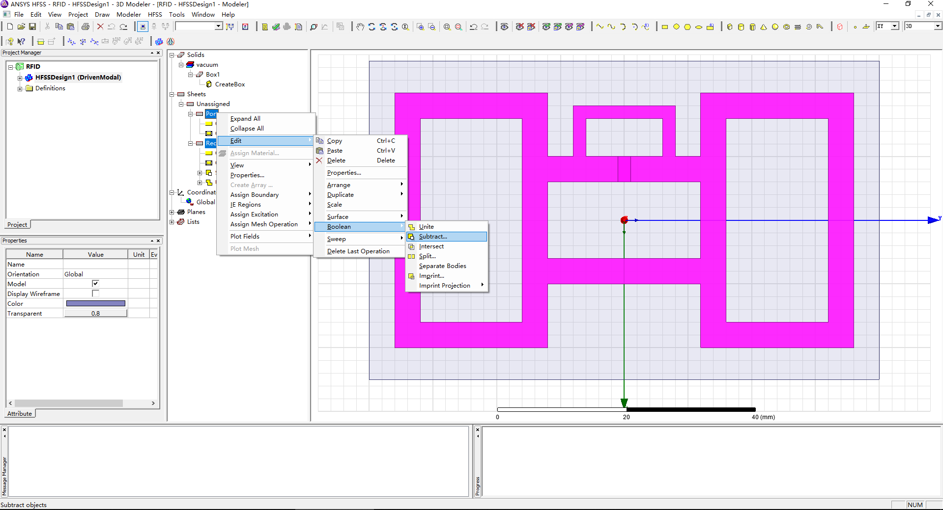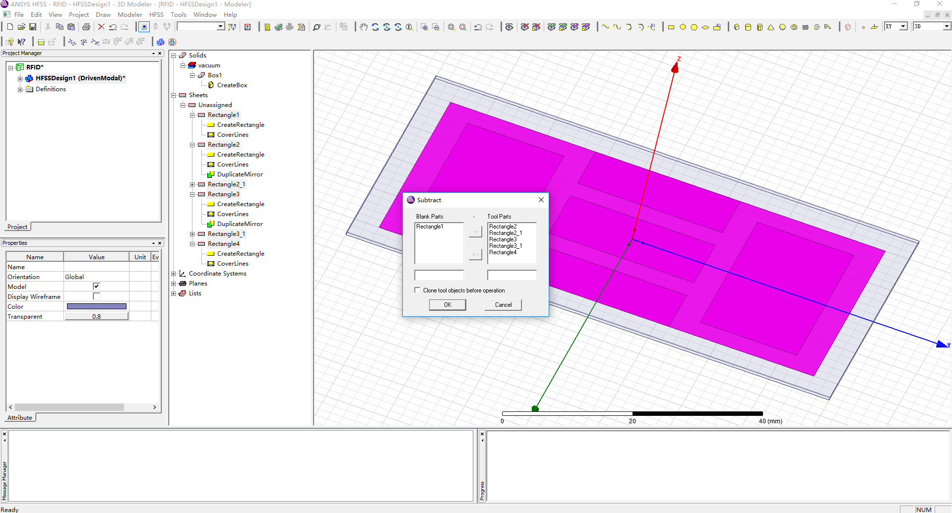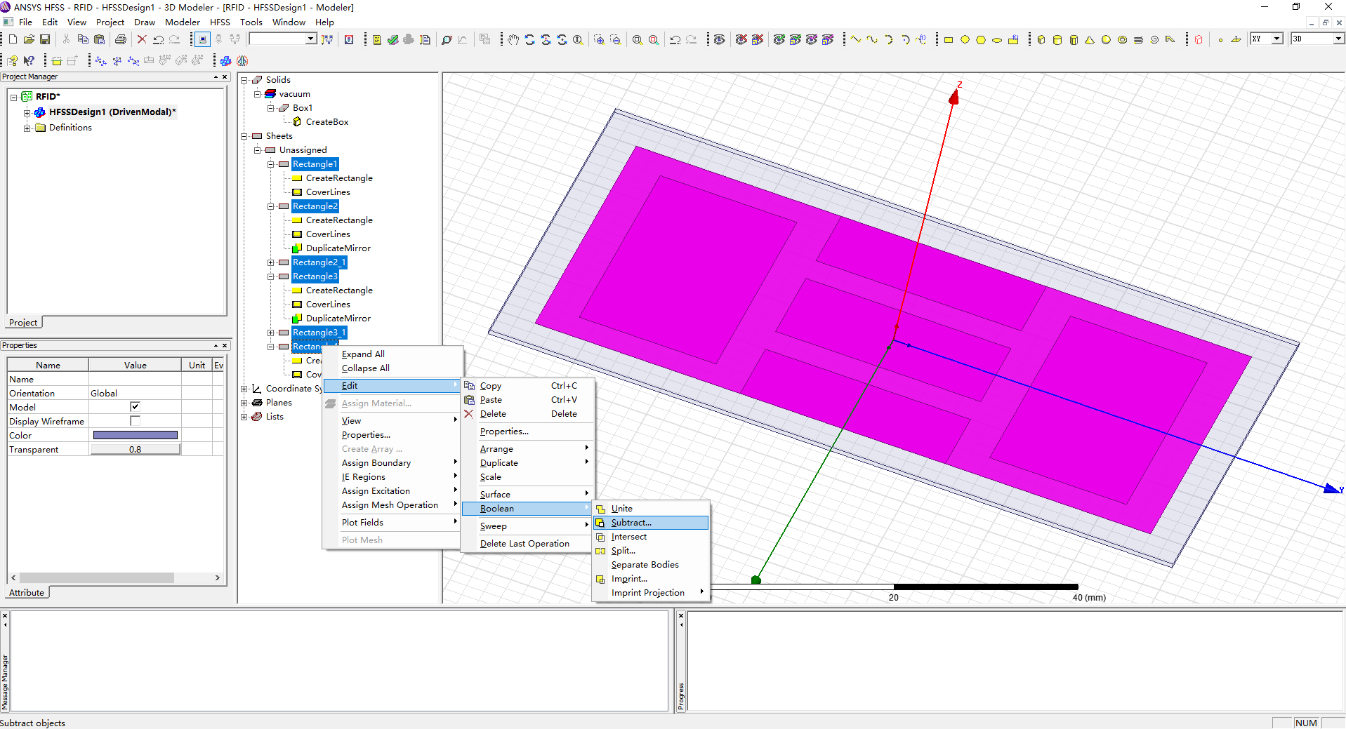 实际上预期天线的图形为在一开始的Box1基底上有金属膜Rectangle1,然后镂空后面的几个Rectangle图形。为了做到这一点,按住Ctrl选择所有Rectangle模型,然后右键选择Subtract。