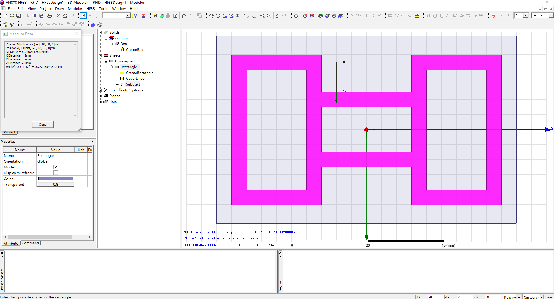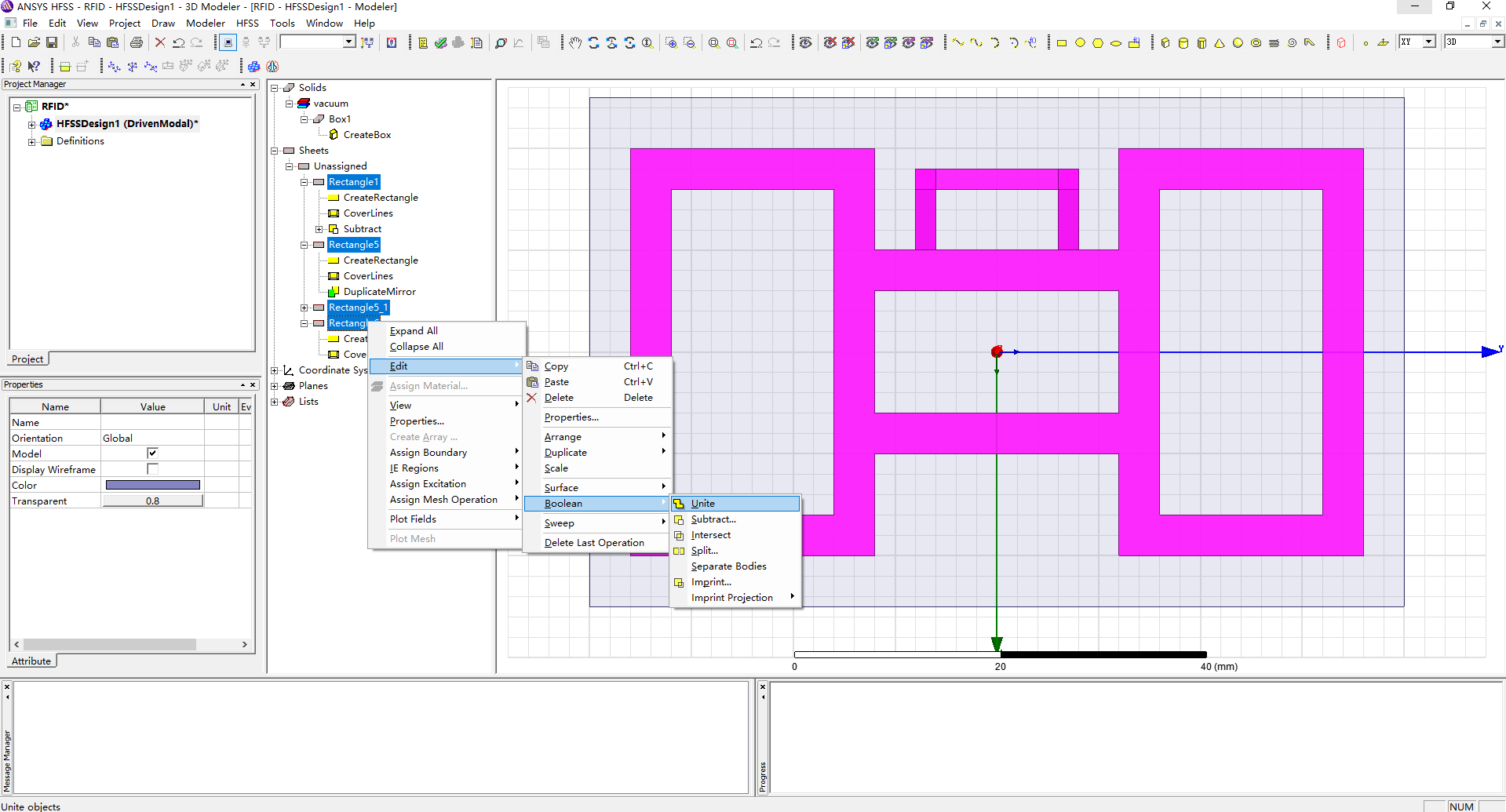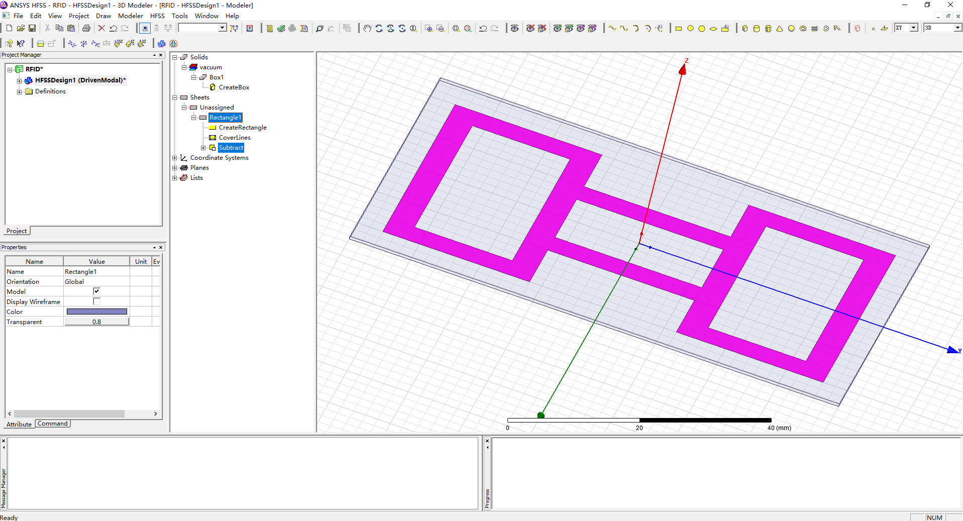 实际上预期天线的图形为在一开始的Box1基底上有金属膜Rectangle1,然后镂空后面的几个Rectangle图形。为了做到这一点,按住Ctrl选择所有Rectangle模型,然后右键选择Subtract。