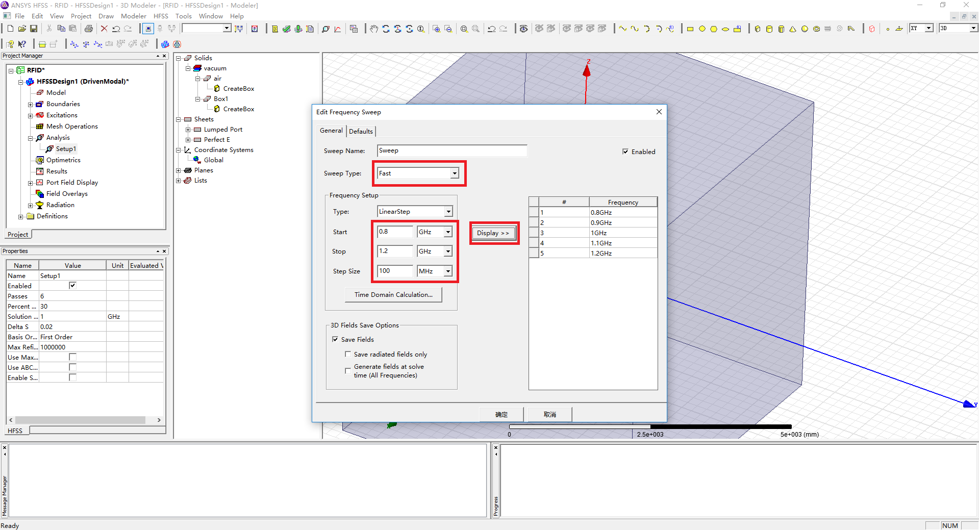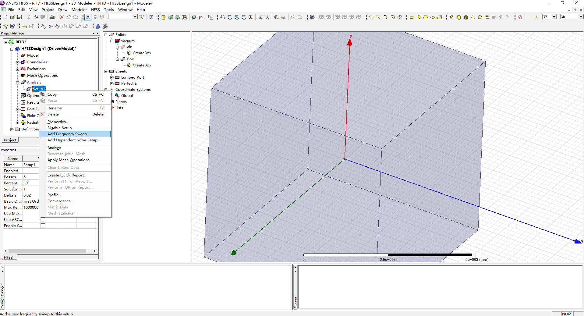 此时在Analysis下出现Setup1选项,右键点击,选择Add Frequency Sweep,进行频率扫描。