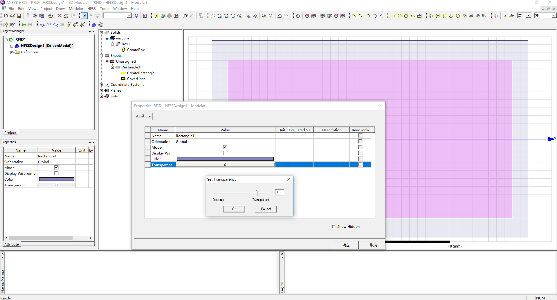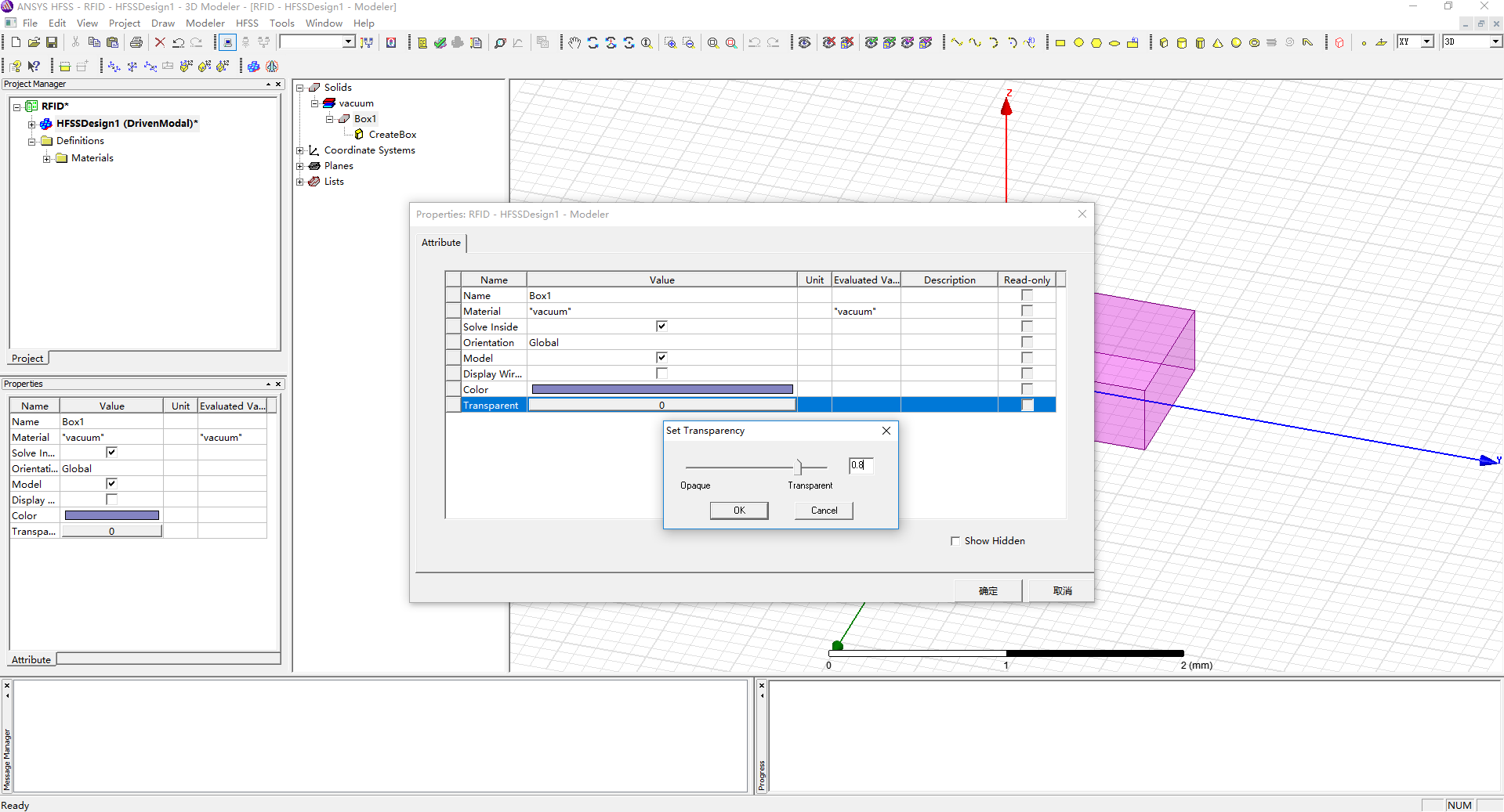 右键点击模型框内的立方体Box1,选择Properties,设置立方体透明度为0.8。