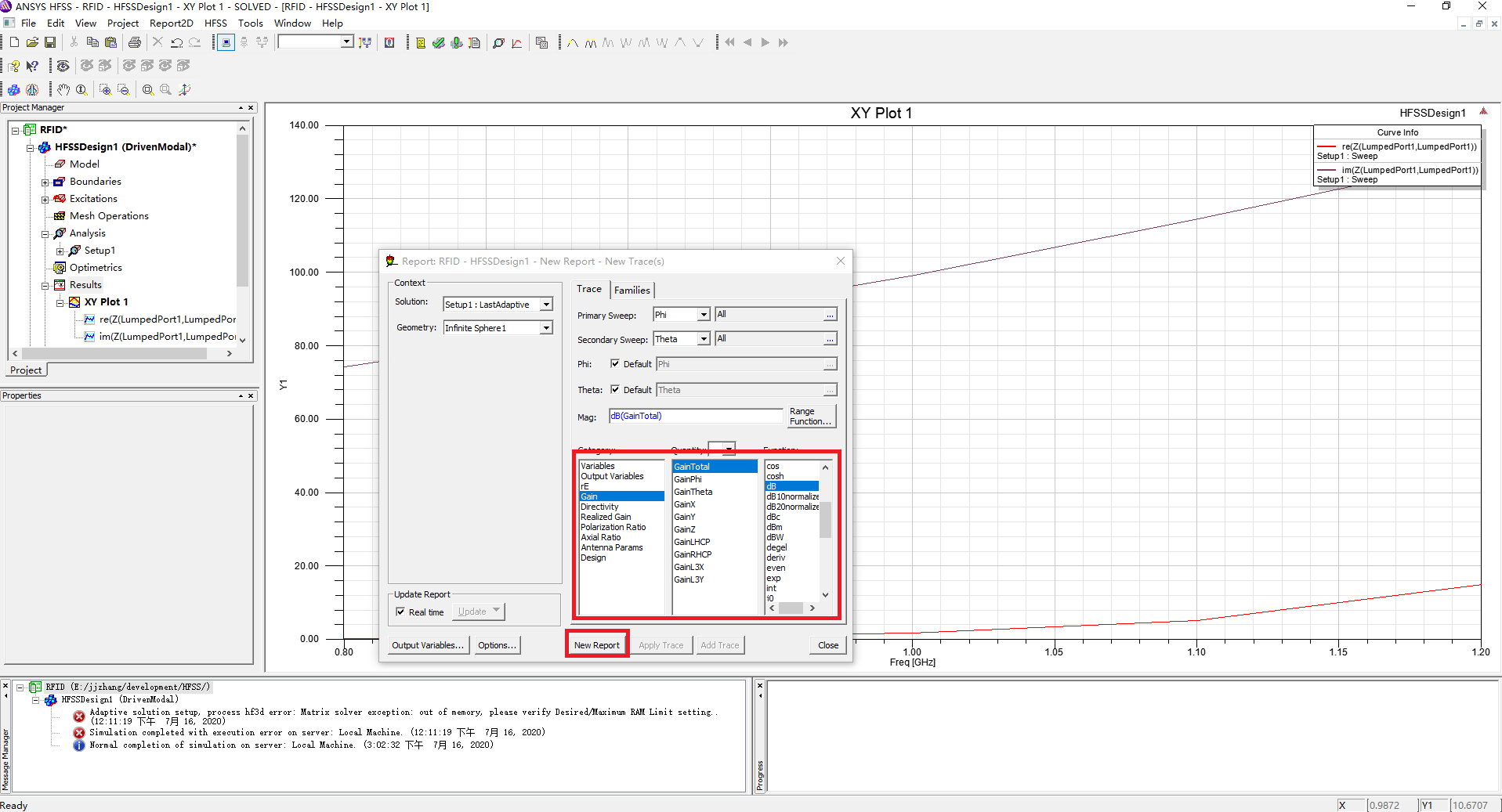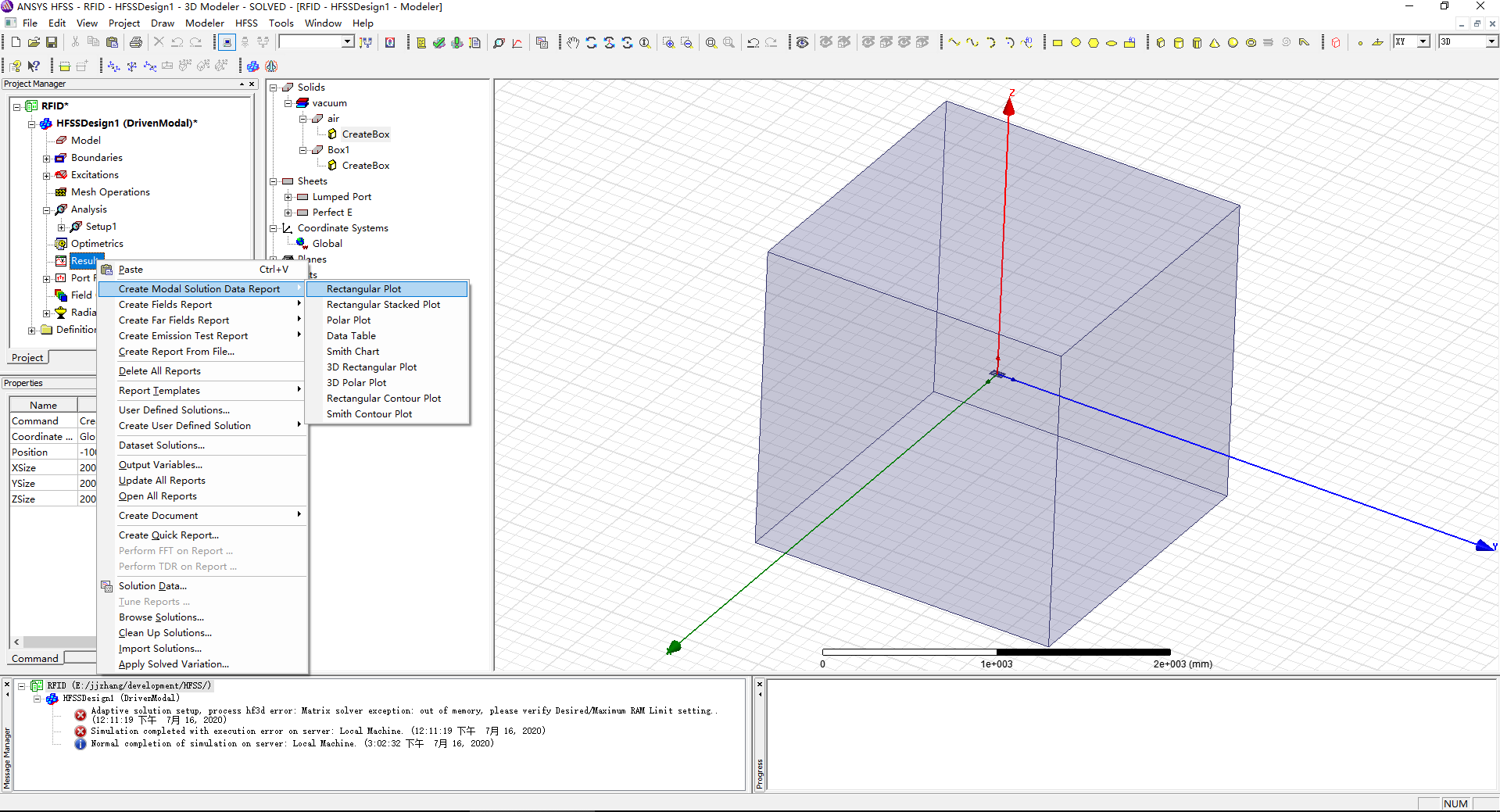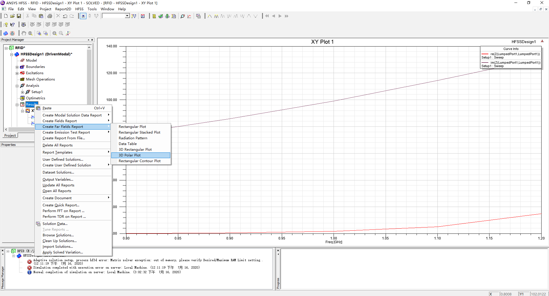 计算完成后即可查看结果了,先看一下天线阻抗的结果。选择Results-Create Modal Solution Data Report-Rectangular Plot,如下图所示。
