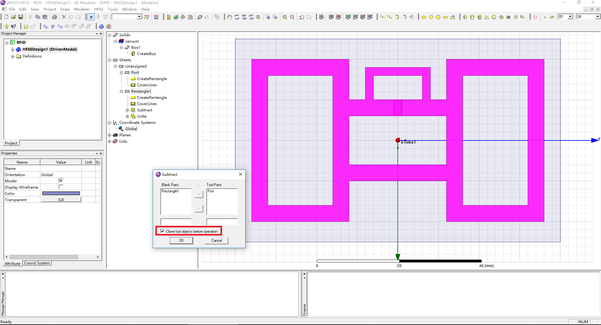 把Port从Rectangle1中减去,注意选中Clone tool objects before operation,保留被减的项。