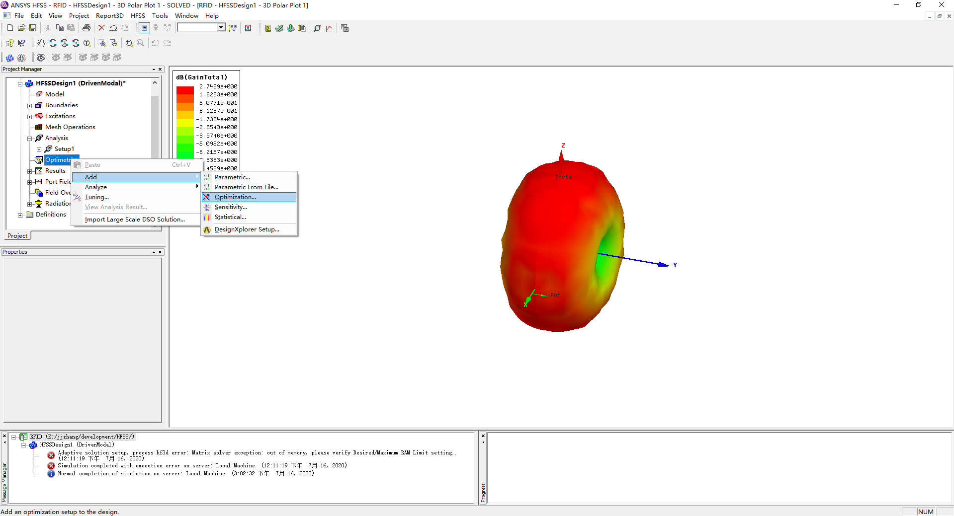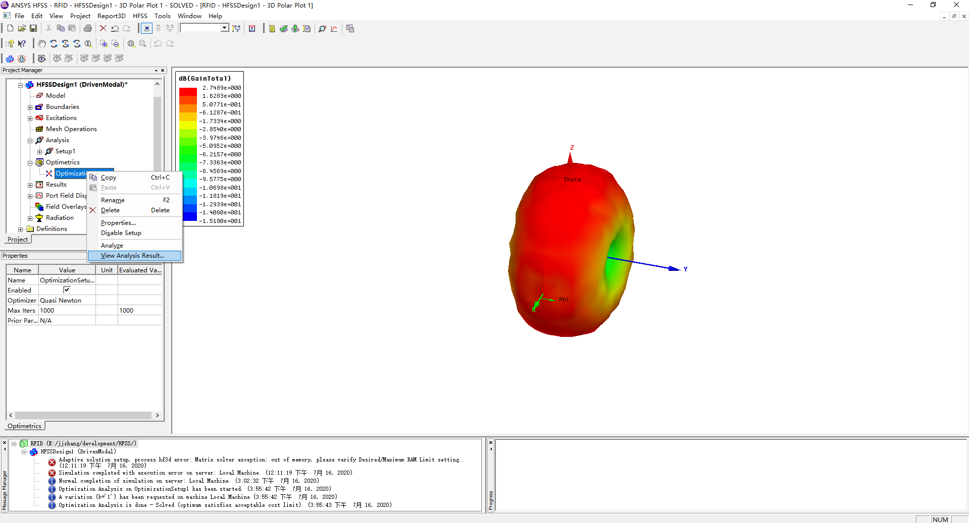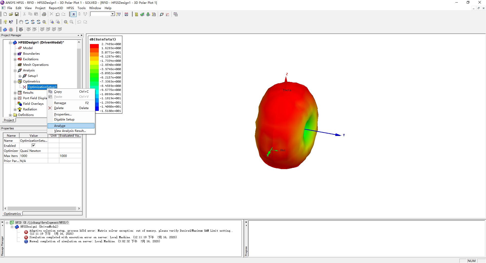 接下来在工程窗口中右键点击OptimizationSetup1-Analyze,开始优化。