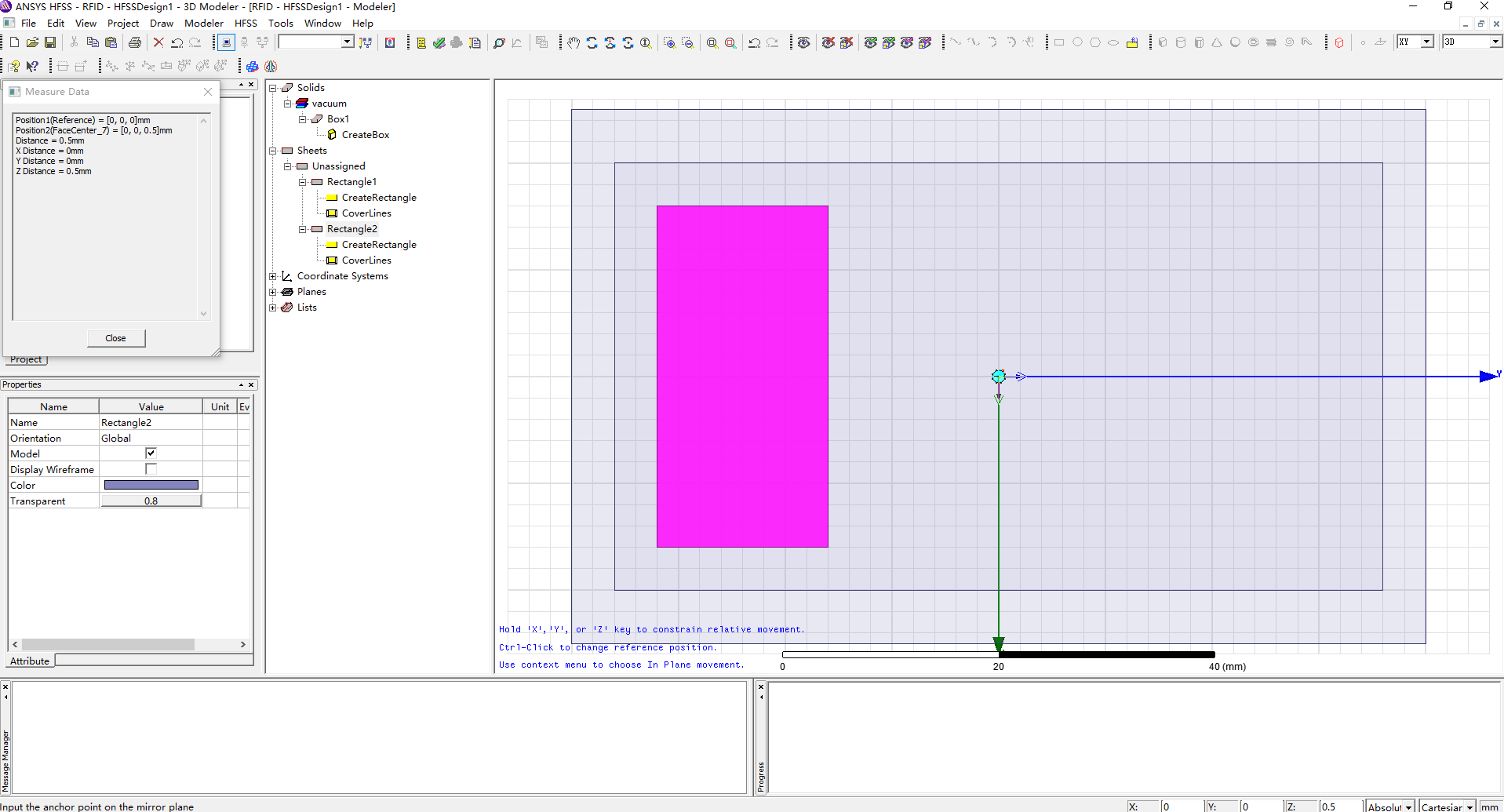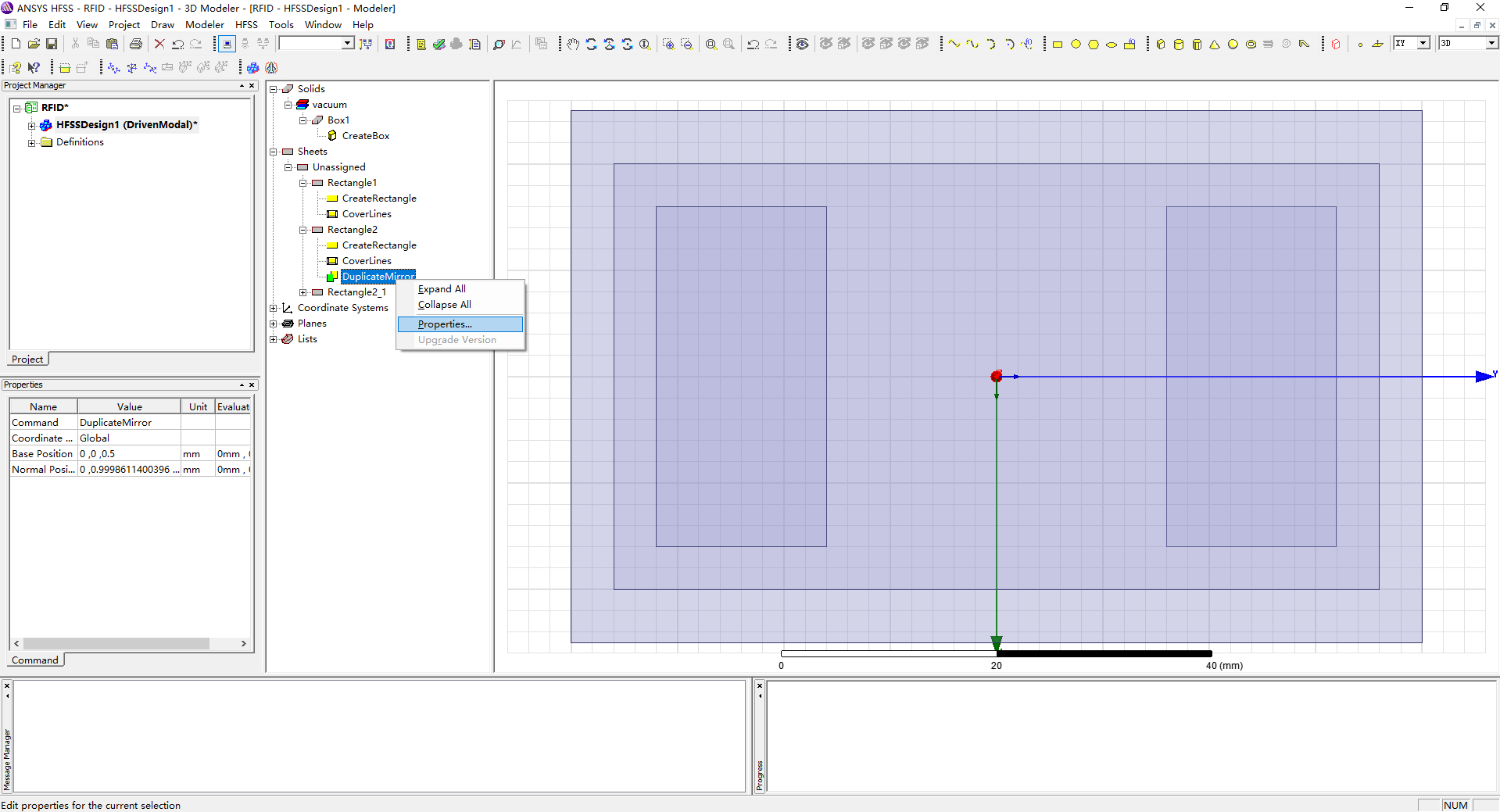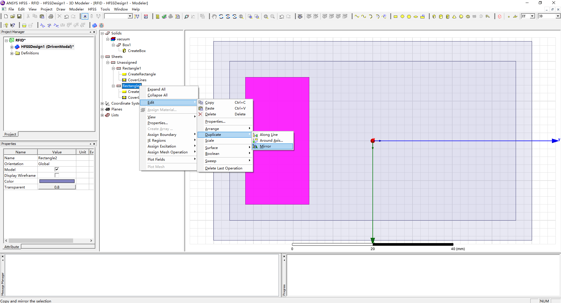 右键选中Rectangle2模型,选择Edit-Duplicate-Mirror,然后选择参考点,放置镜像。