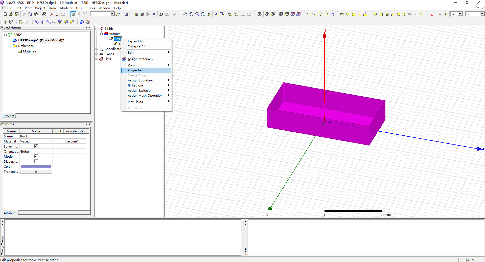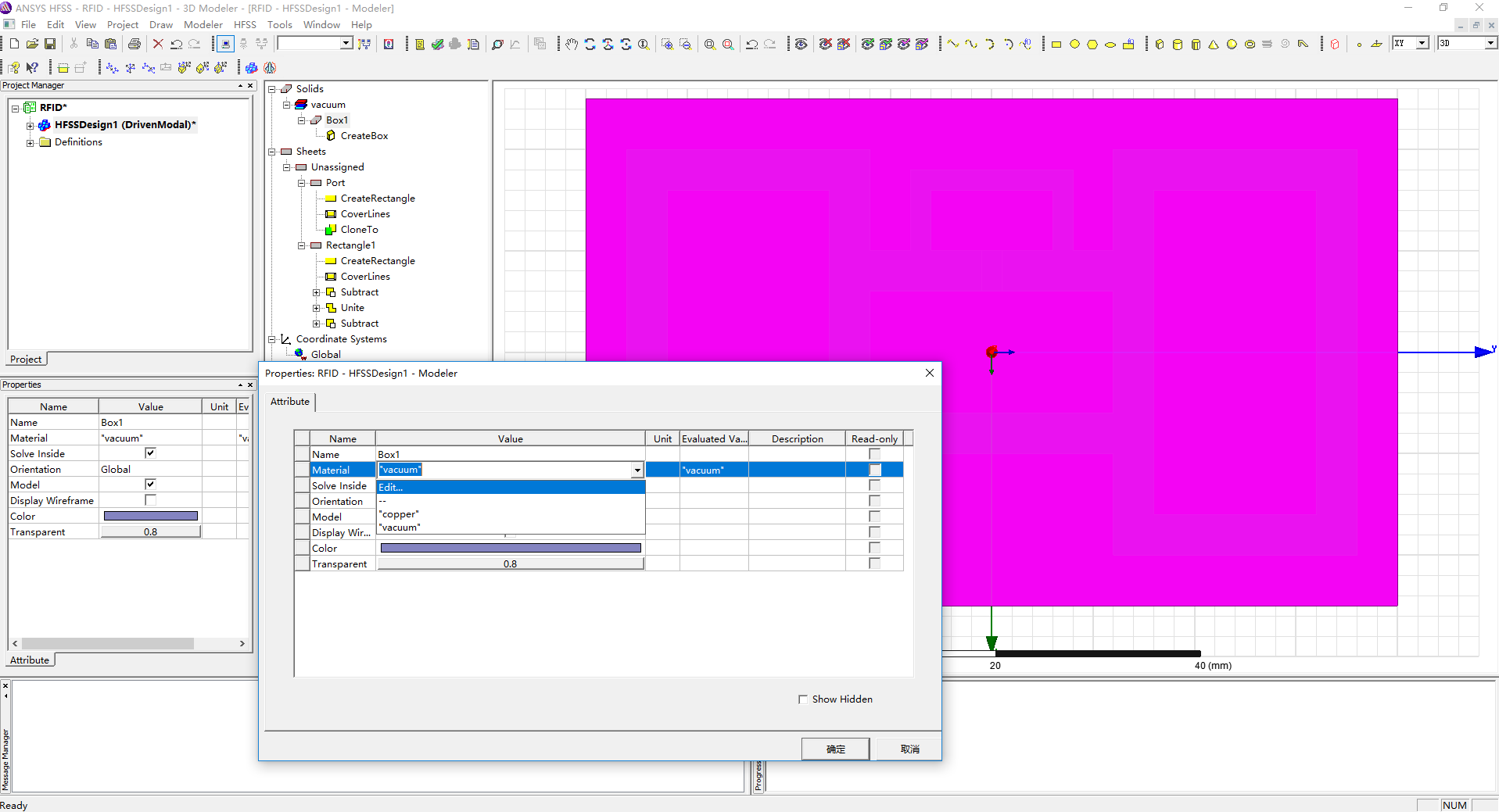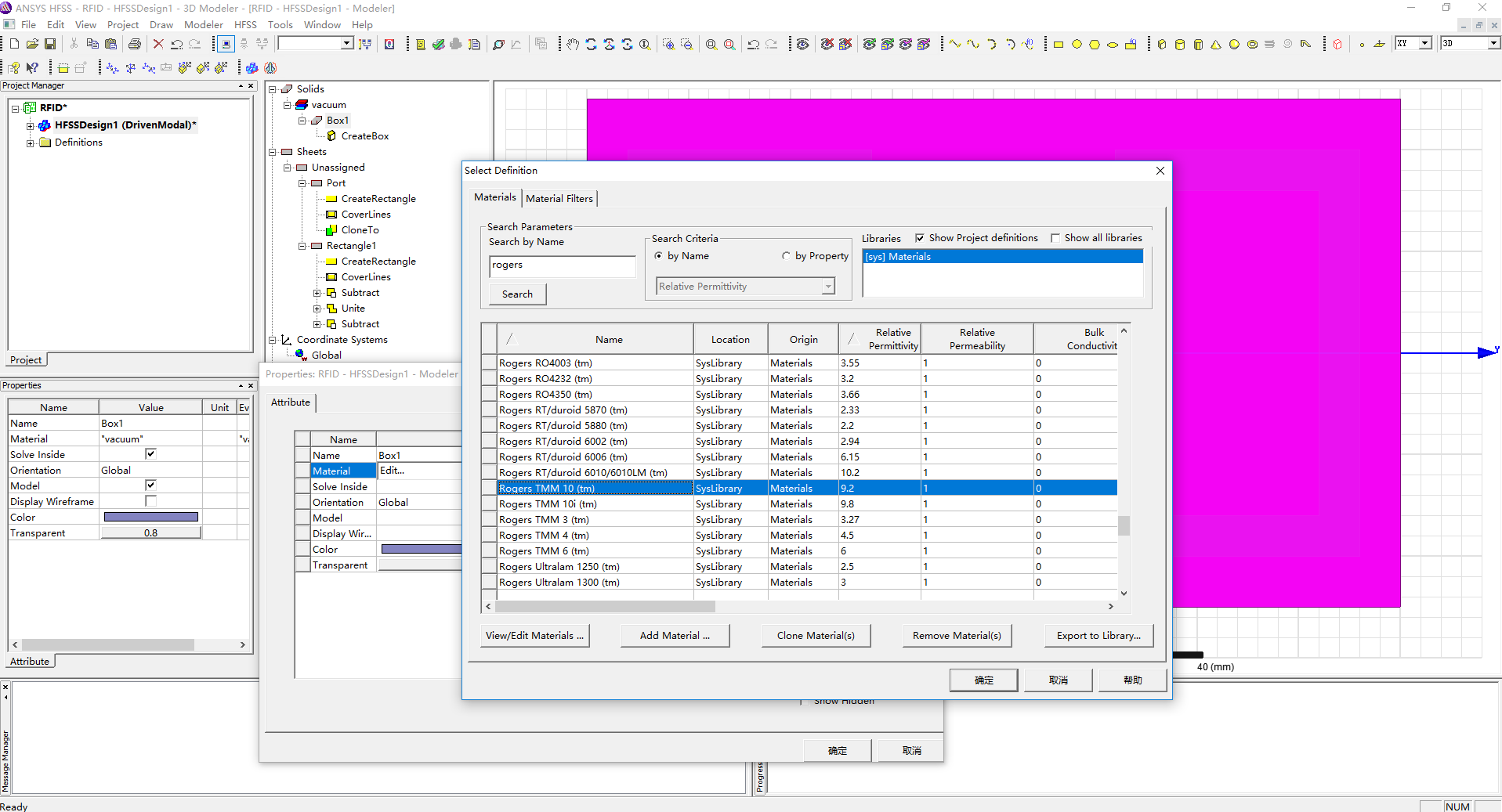 选择Box1,在属性中设置材质为Rogers TMM 10。