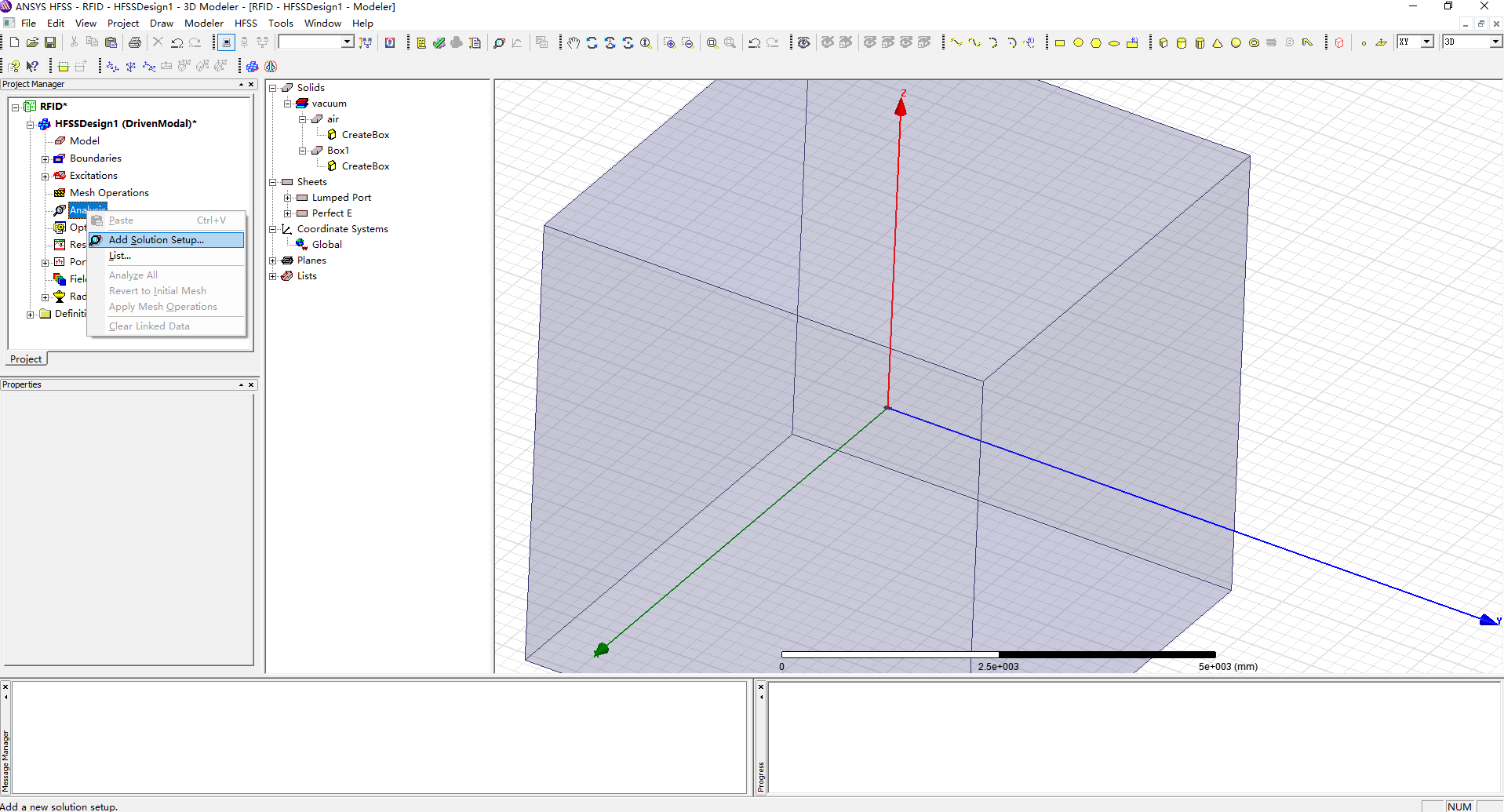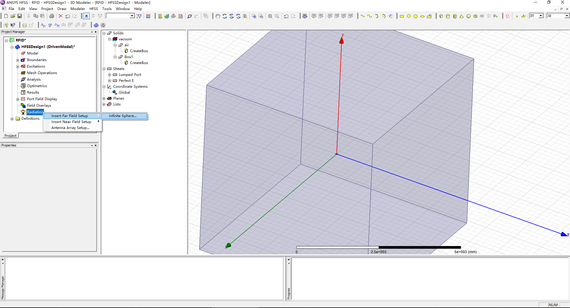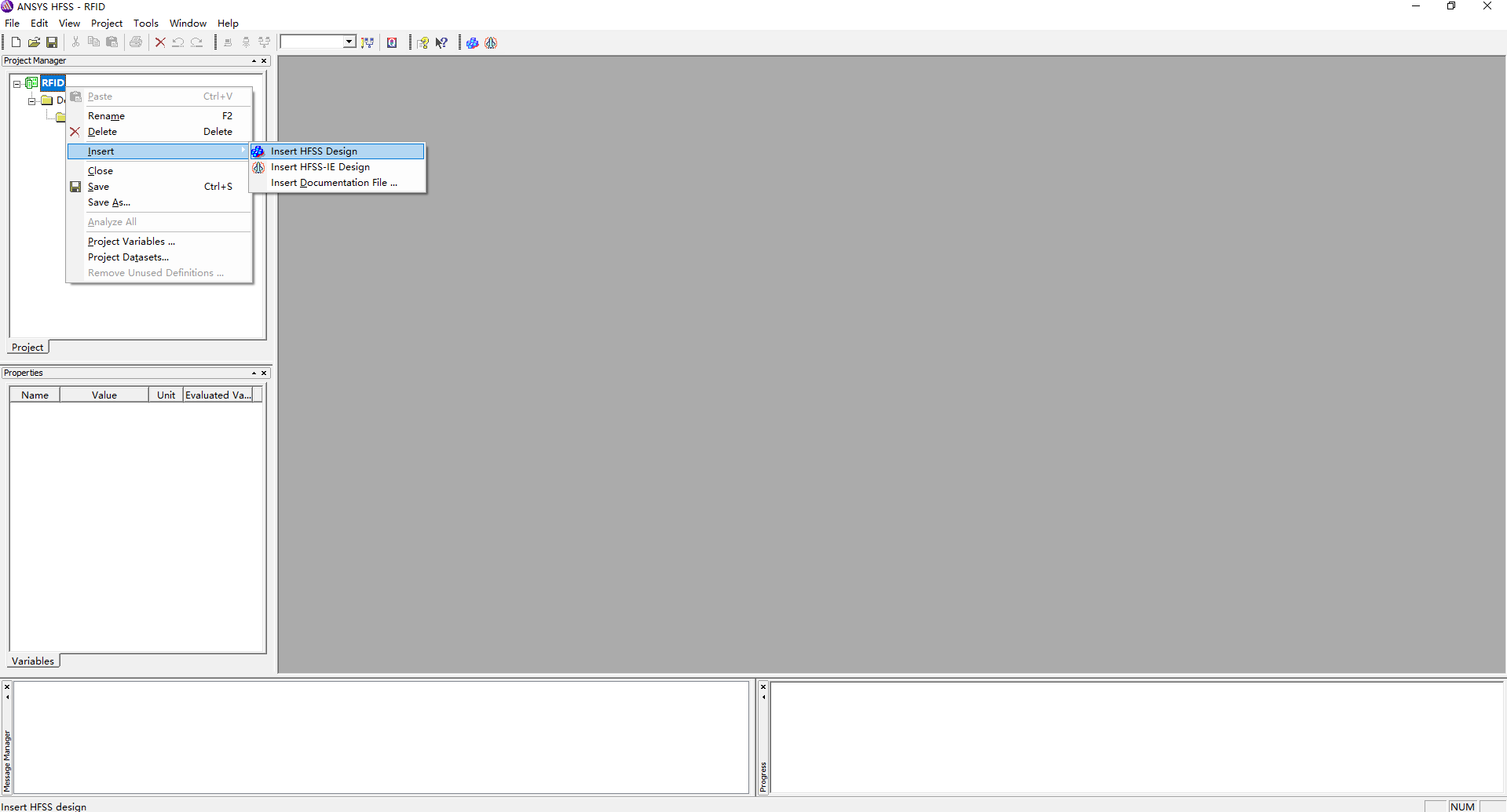 选择File-Save As将工程另存到指定目录下,然后在工程中插入HFSS设计,如下所示。