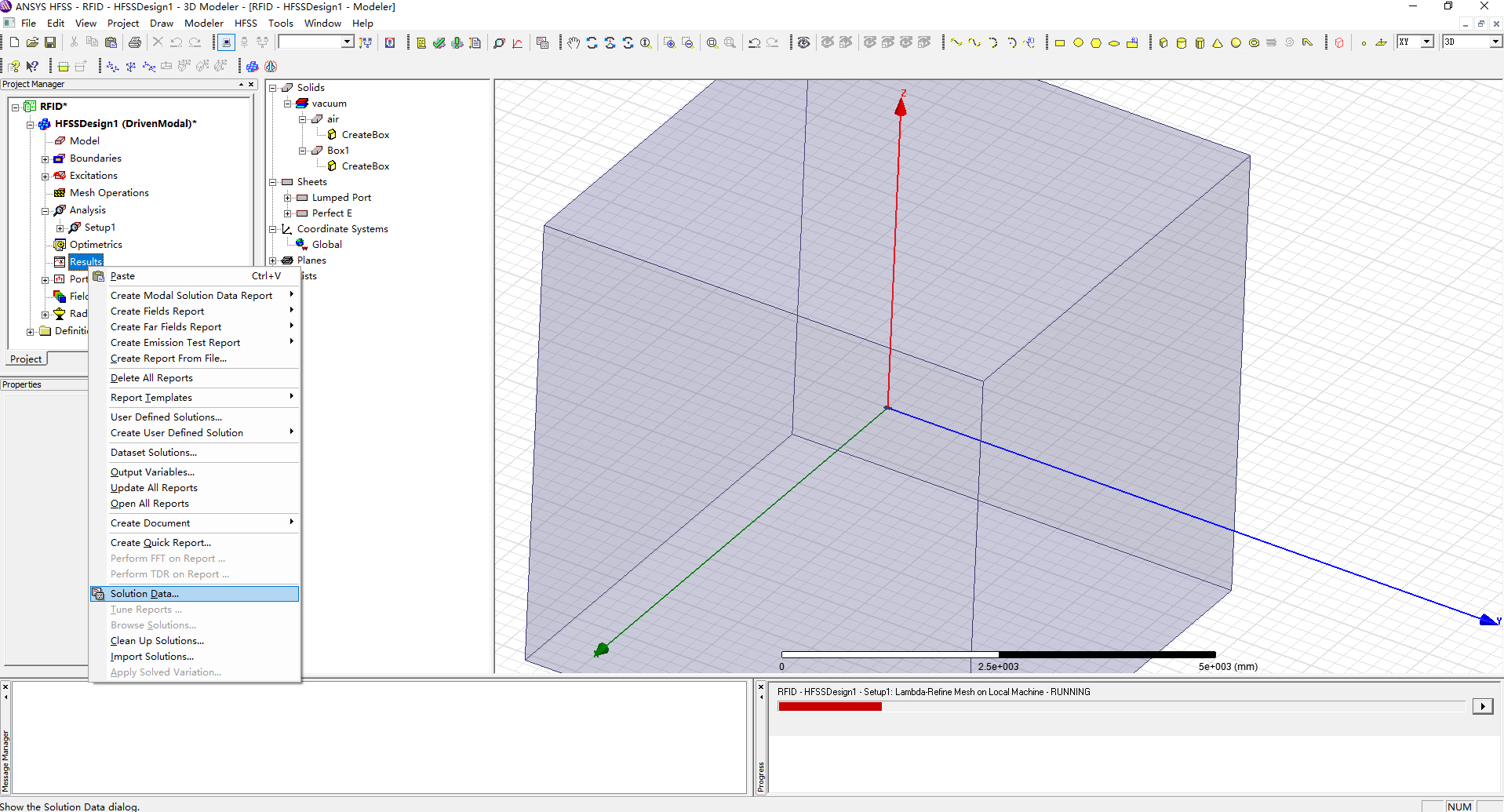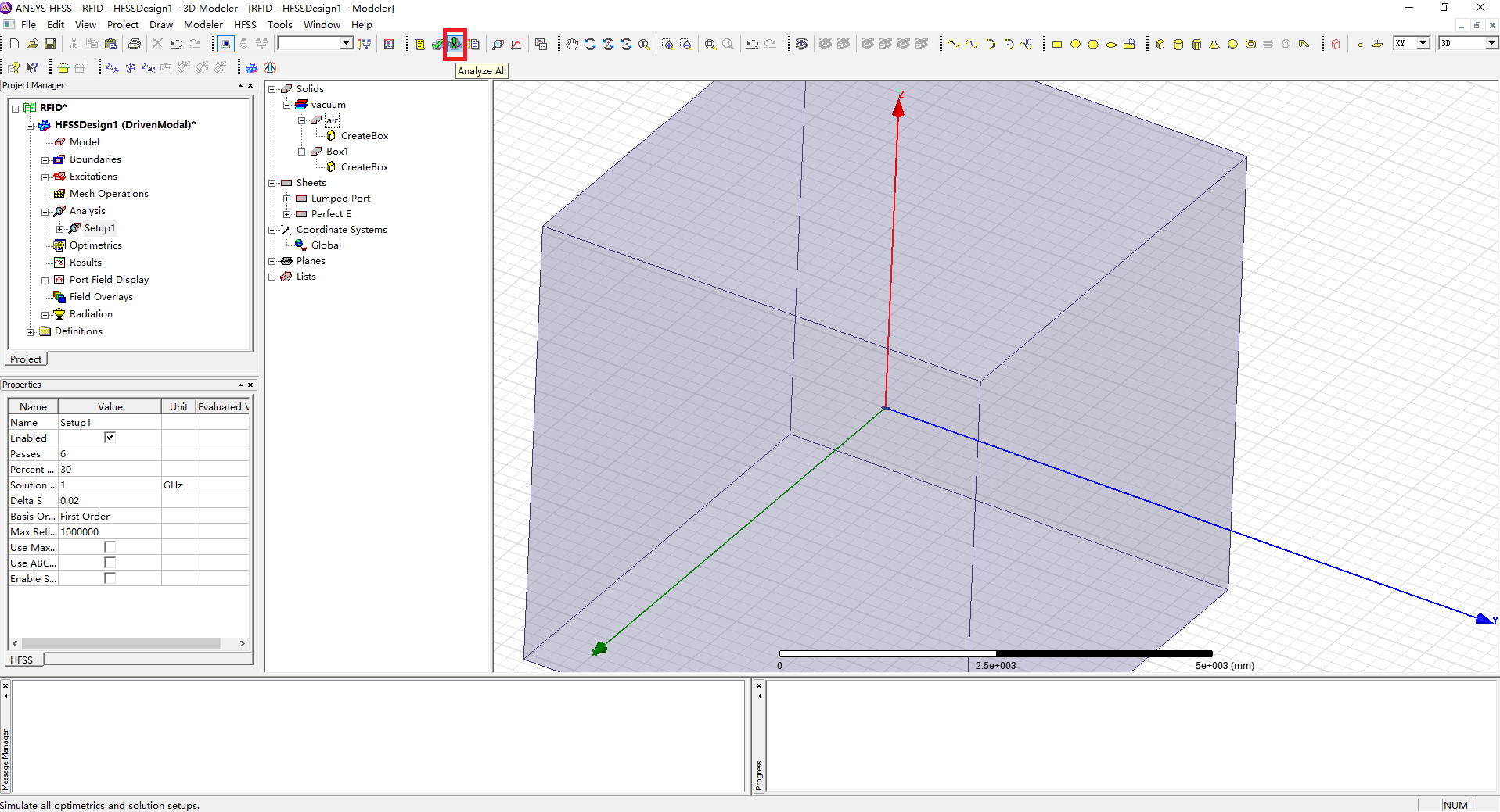 最后说一下参数的优化。通常情况下,不可能一开始设计的尺寸就是最优的,HFSS提供了参数优化的功能,这也是前面设计时采用变量尺寸的原因,下面是参数优化的操作过程。