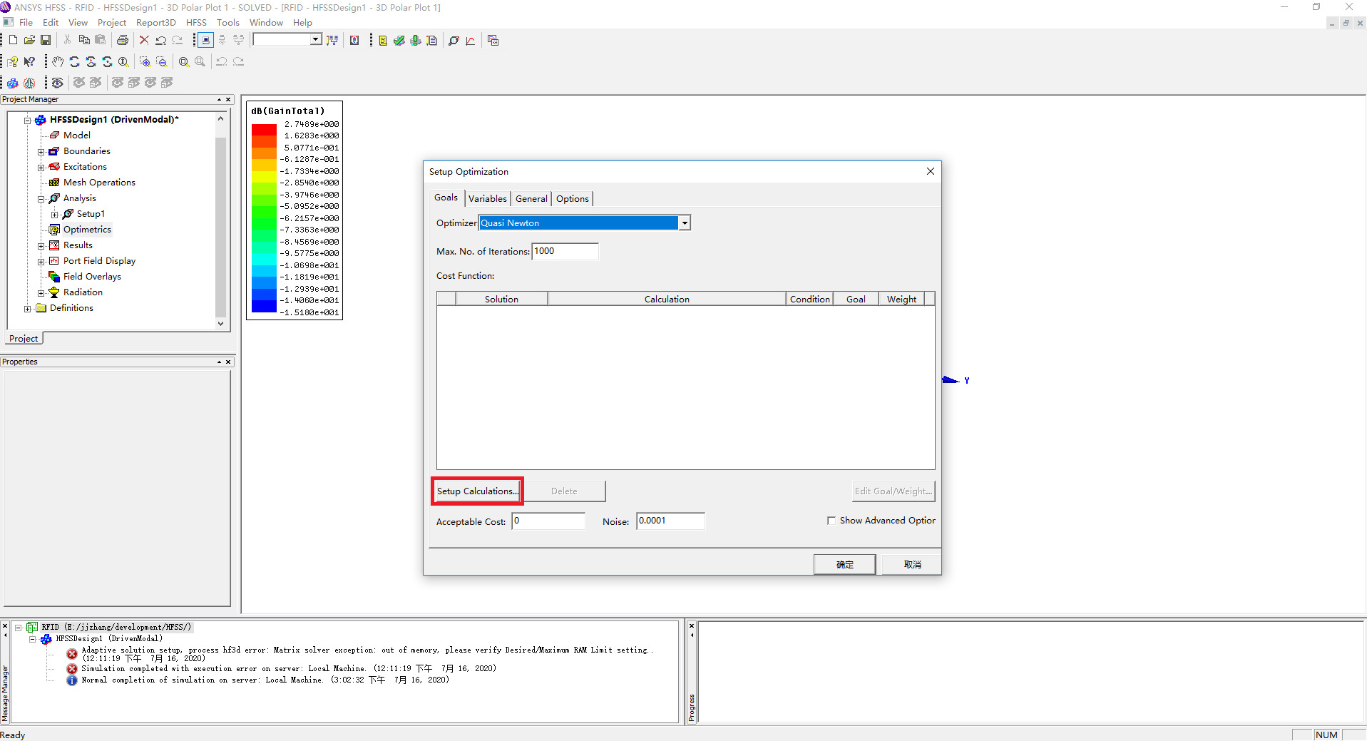 在左侧工程窗口中右键点击Optimetrics-Add-Optimization,在弹出的对话框中点击Setup Calculations,设置优化目标。