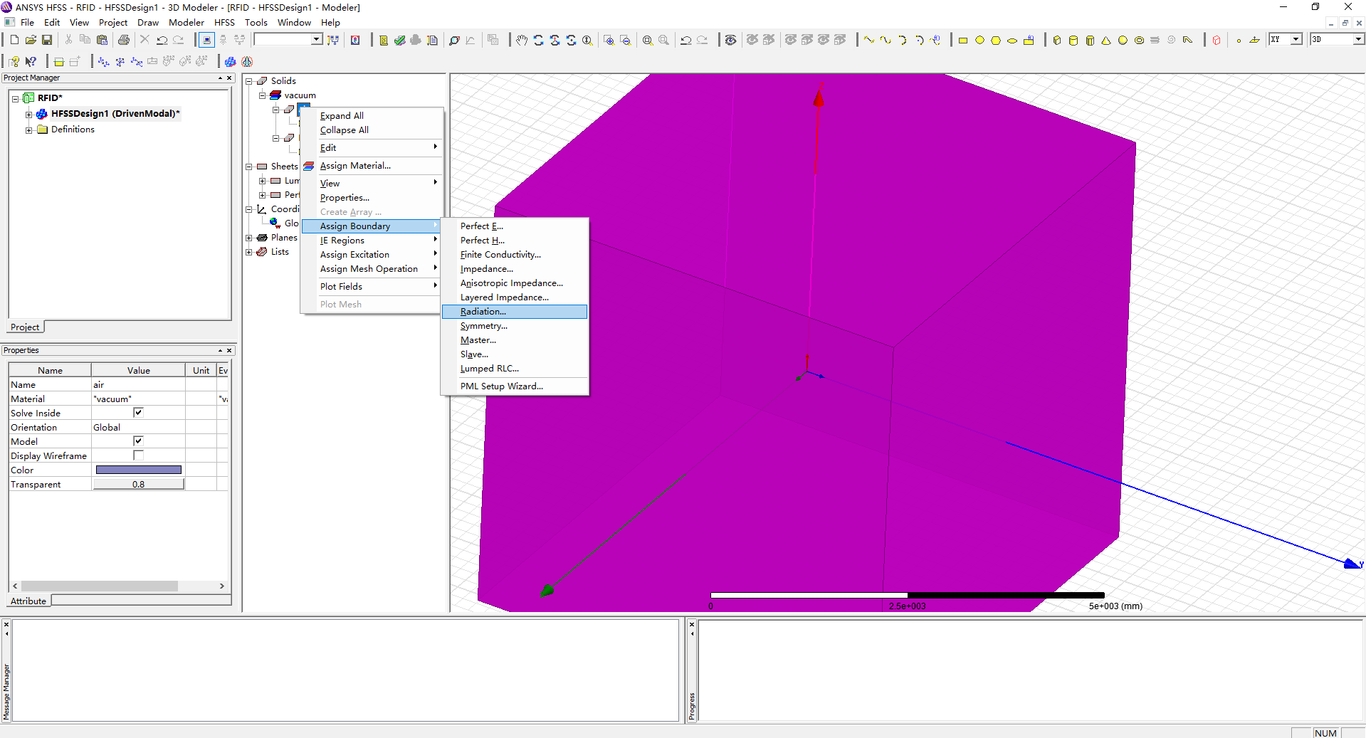 右键选中air,选择Assign Boundary-Radiation,完成辐射边界条件的设置。