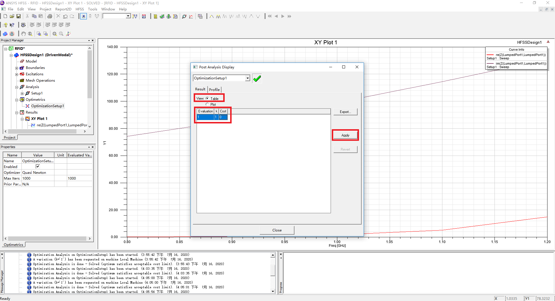 选择对话框中Table项,选择Cost最小的一项(此处只有一项),再单击Apply,即可将此优化后选中的值保存下来。