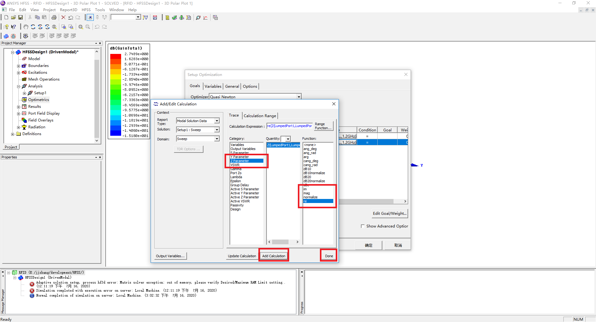 在弹出窗口中选择 Z Parameter,先选择右边im(阻抗虚部),点击Add Calculation添加第一个优化目标;再选择re(阻抗实部),点击Add Calculation添加第二个优化目标。结束之后点击Done完成设置。