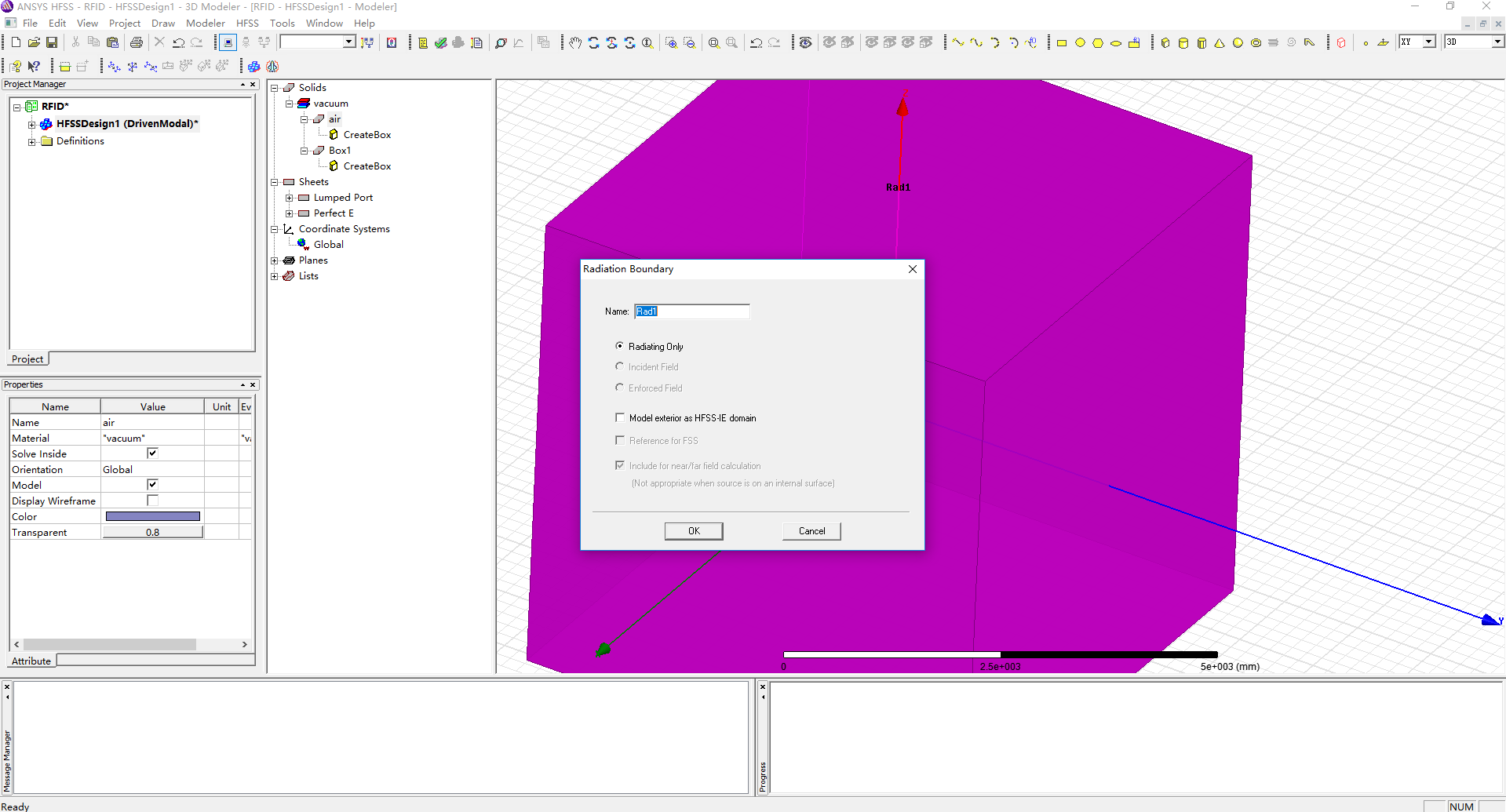 最后设置辐射边界,创建一个大立方体air如下所示,