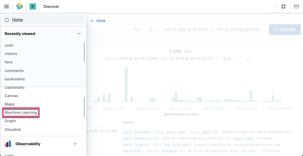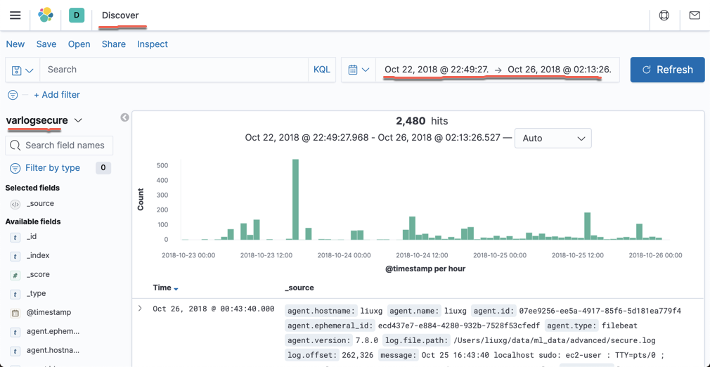 从上面我们可以看出来,我们的数据位于2018-10-22 日到2018-10-26之间。在上面我们可以看到一个叫做 message 的字段,它含有我们最原始信息的所有文字。这个 message 字段将在一下被用于 categorization。