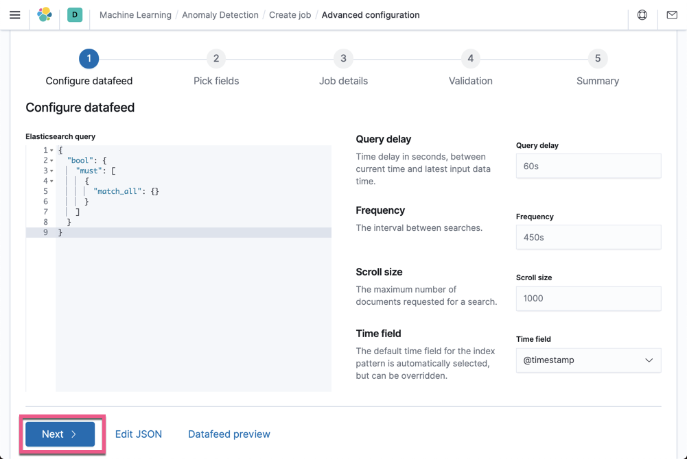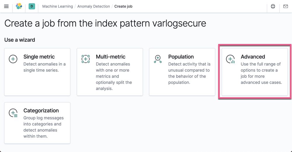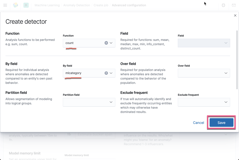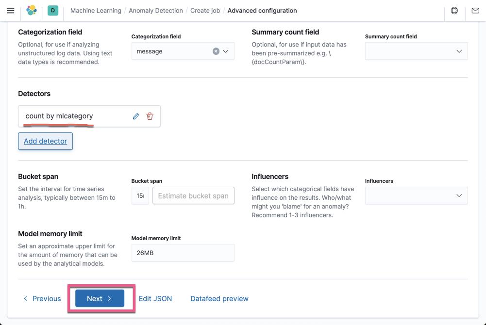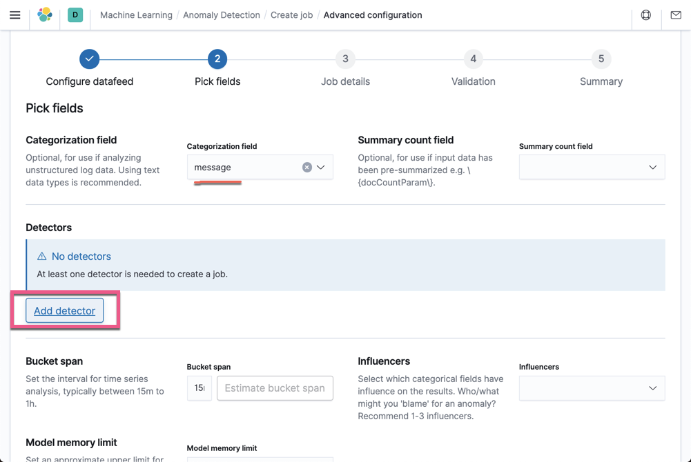 在 Categorization field 中,我们选择 message 字段。点击 Add detector: