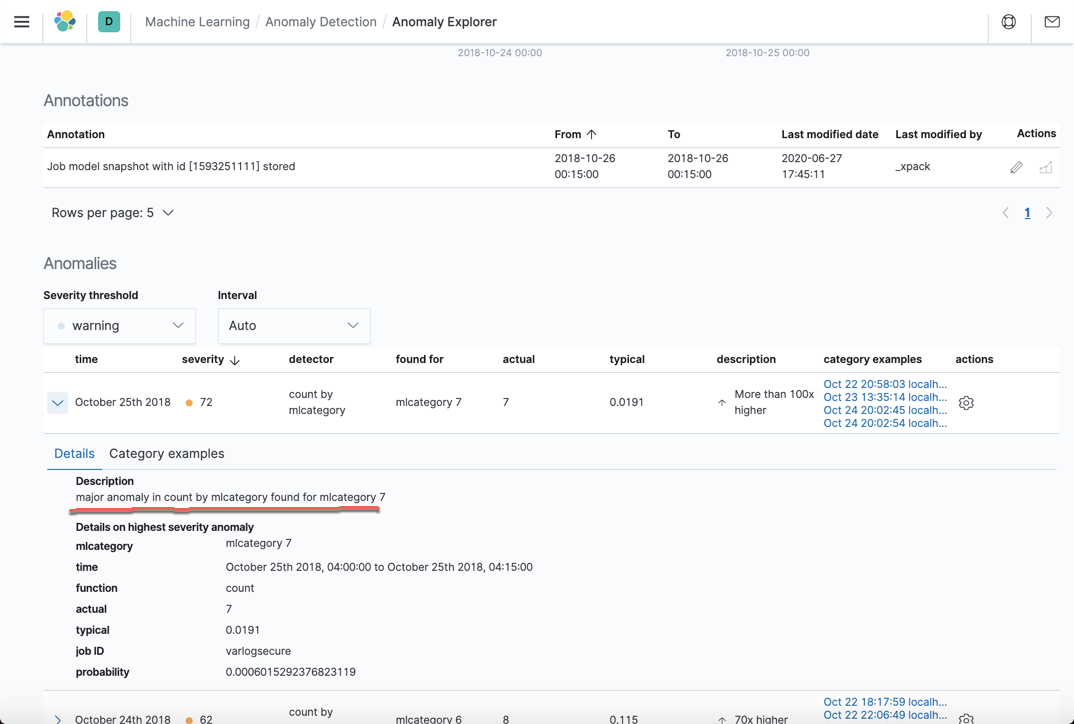 我们可以看到有一个是 mlcategory 7 的异常。它典型的值是0.00192,但是实际上它出现的事件总数是7 。属于一个不正常的事件。