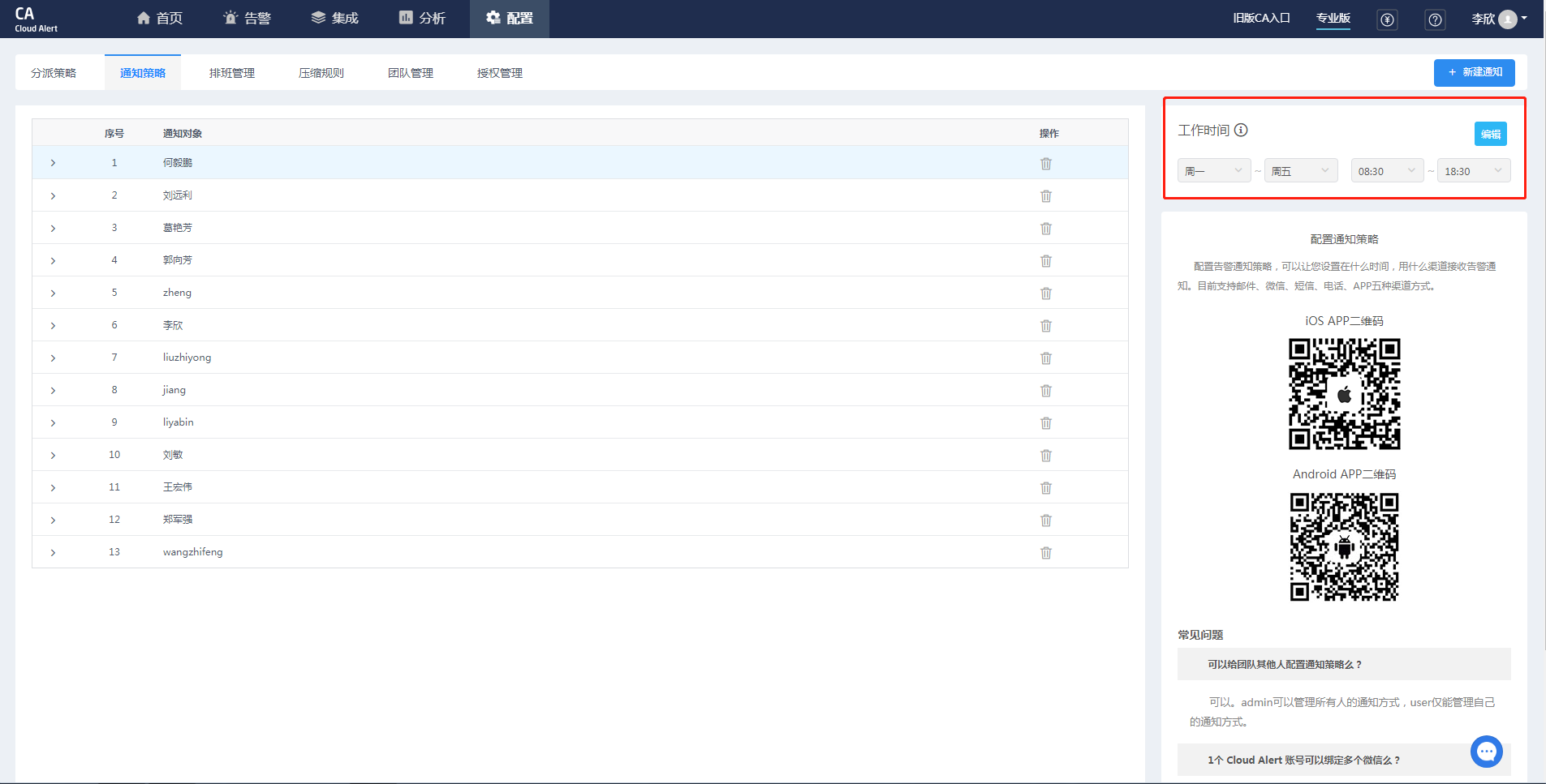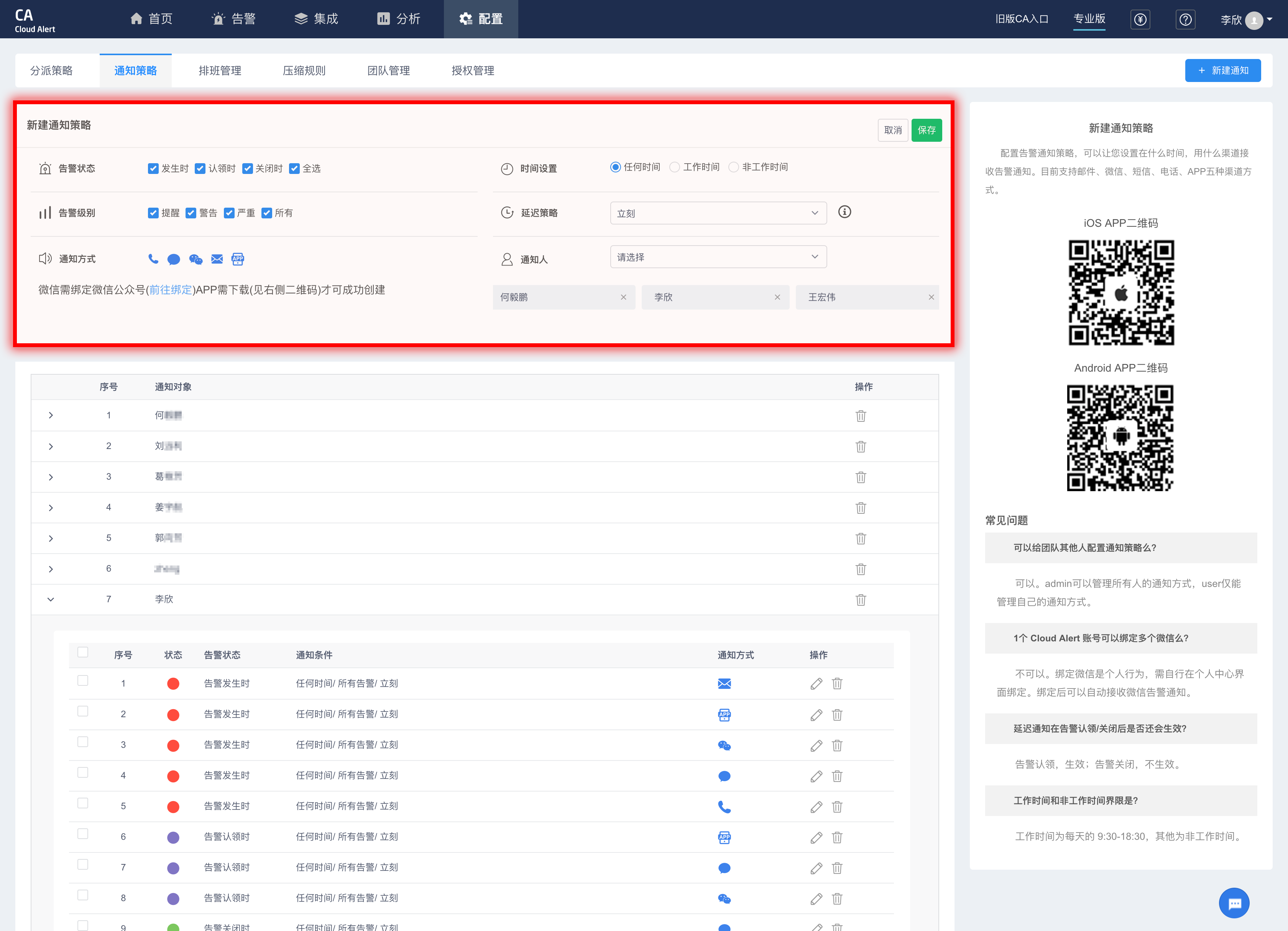 admin 可以统一管理(新增、编辑、删除、查看)所有人的通知策略,user 仅能管理自己的通知策略。所以通知人处,user默认选择本人,admin可以一次性配置多人。