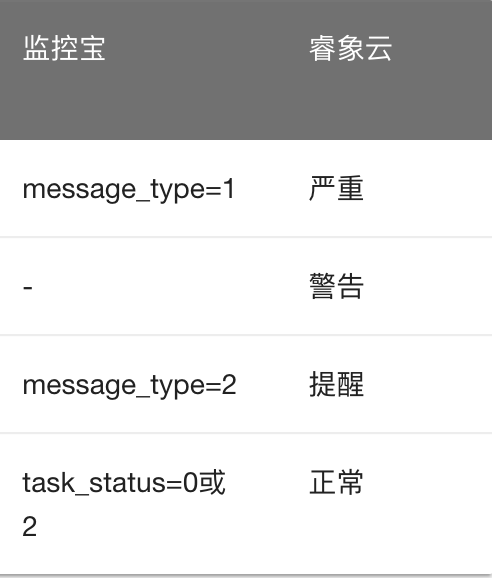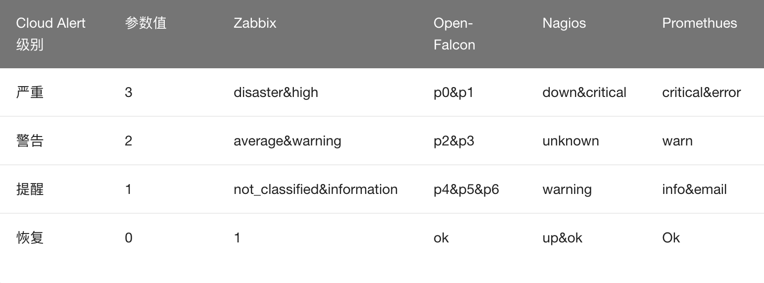 其他监控工具告警级别对应关系如下:
