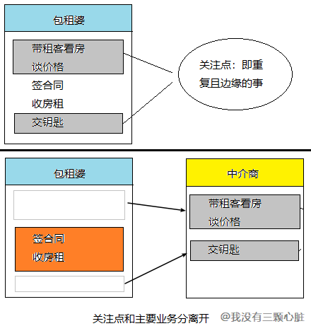 在上面的例子中,包租婆的核心业务就是签合同,收房租,那么这就够了,灰色框起来的部分都是重复且边缘的事,交给中介商就好了,这就是 AOP 的一个思想:让关注点代码与业务代码分离!