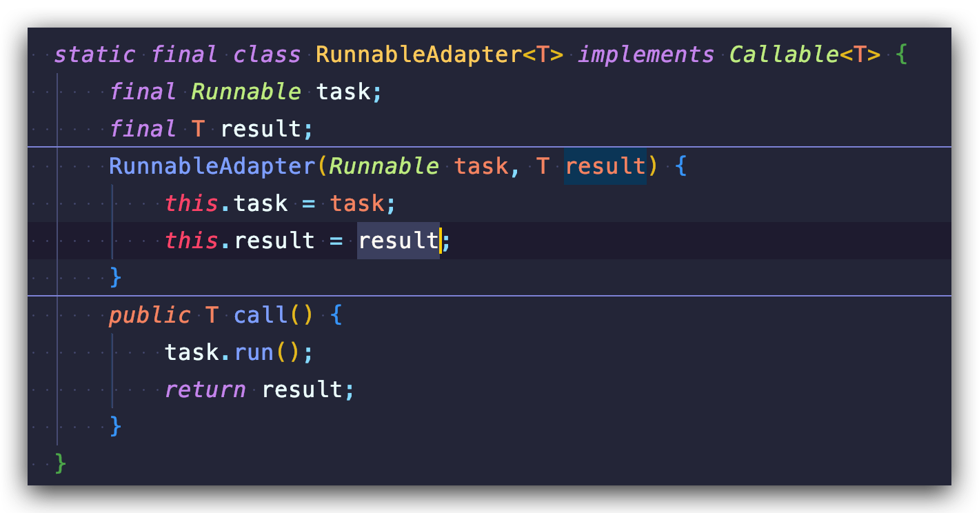 // 小细节:由于 call 方法会抛出 Exception,这里不用像使用 Runnable 的run 方法那样 try/catch 了