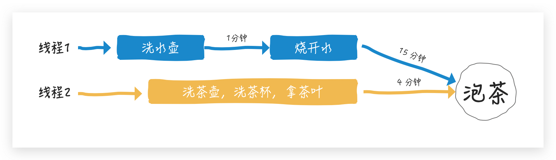 让我心算一下,如果串行总共需要 20 分钟,但很显然在烧开水期间,我们可以洗茶壶/洗茶杯/拿茶叶