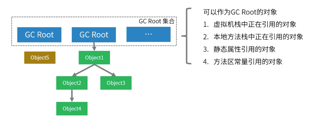 - 然后跟踪引用链条,如果一个对象和 GC Roots 之间不可达,也就是不存在引用,那么即可认为是可回收对象。