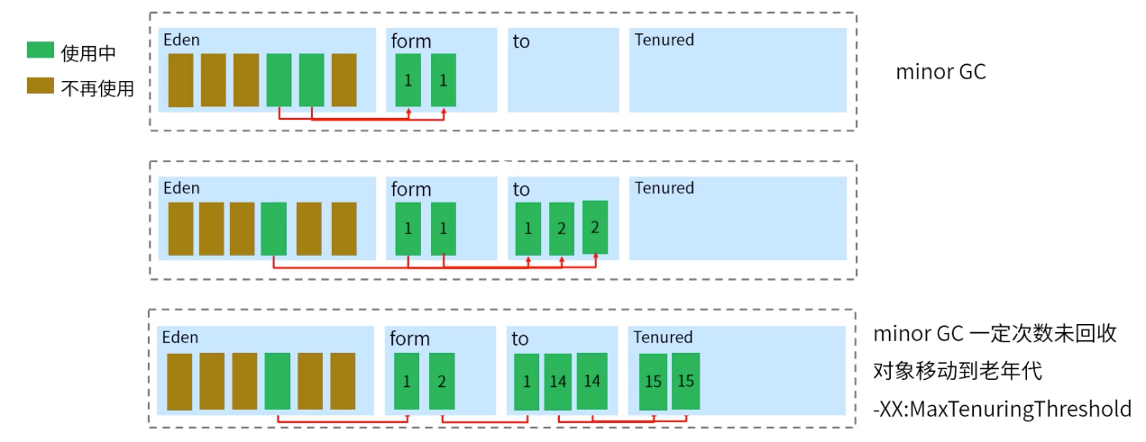 红色新生代(Eden 和 Surivor),淡蓝色老年代。找不到大内存时执行 FullGC。